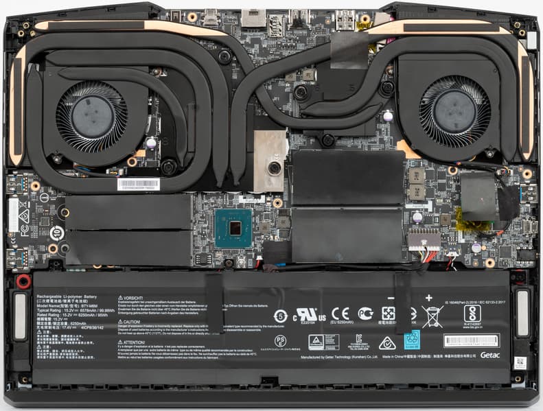 Заглянем внутрь. Можно разглядеть большой встроенный аккумулятор, два вентилятора и теплоотводящие медные трубки системы охлаждения.