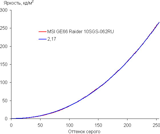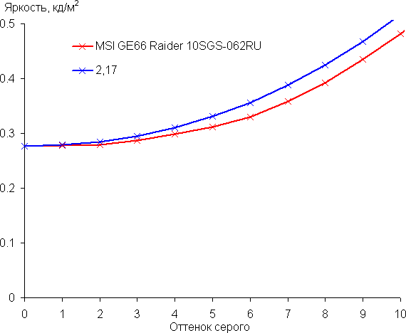 Рост прироста яркости на большей части шкалы серого более-менее равномерный, и каждый следующий оттенок ярче предыдущего. В самой темной области аппаратно и визуально различаются все оттенки: