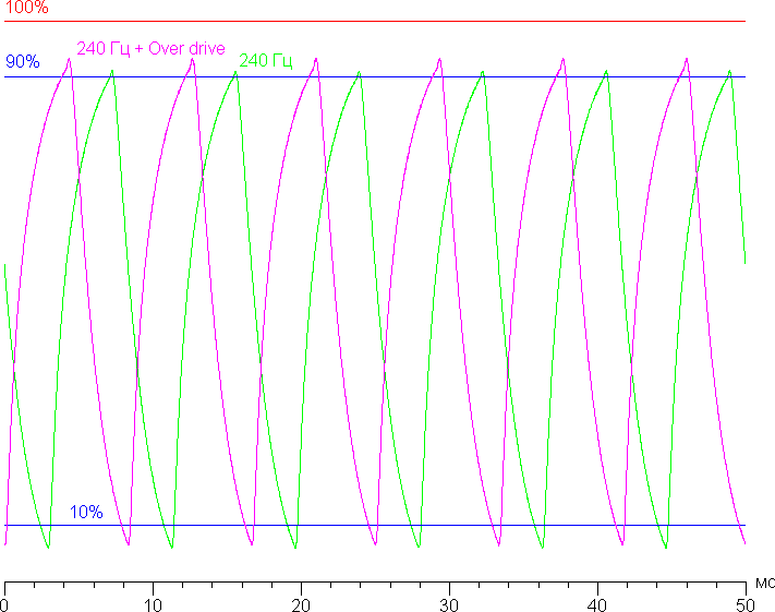 Видно, что в обоих случаях максимальная яркость белого кадра превышает уровень 90% от белого, а минимальная яркость черного кадра ниже 10% от белого. То есть скорости матрицы достаточно для полноценного вывода изображения с кадровой частотой 240 Гц.