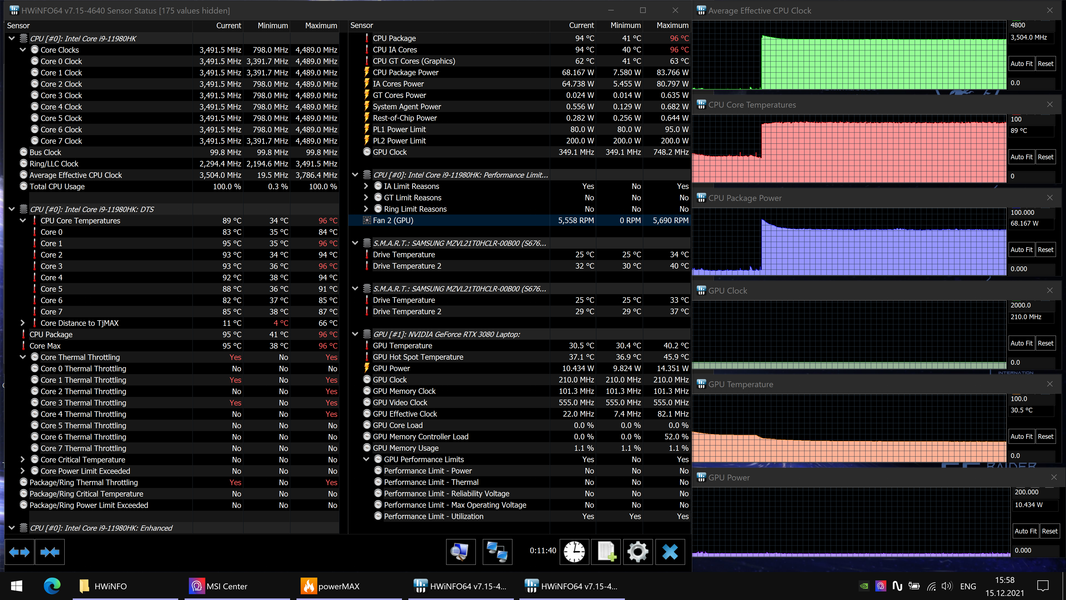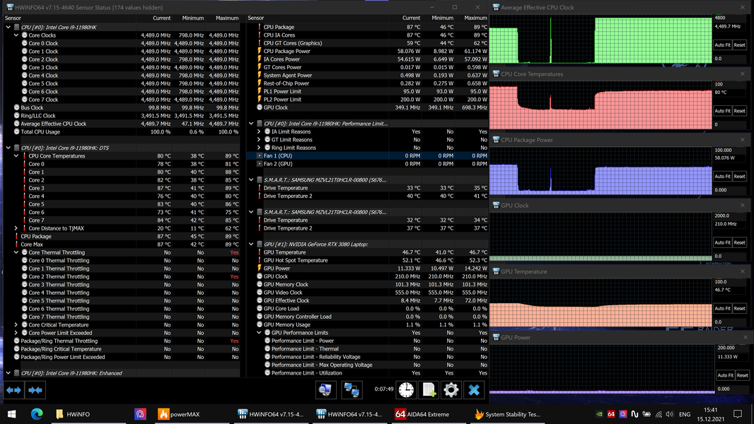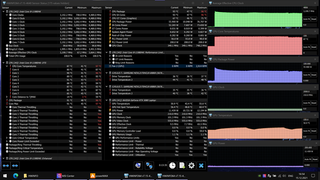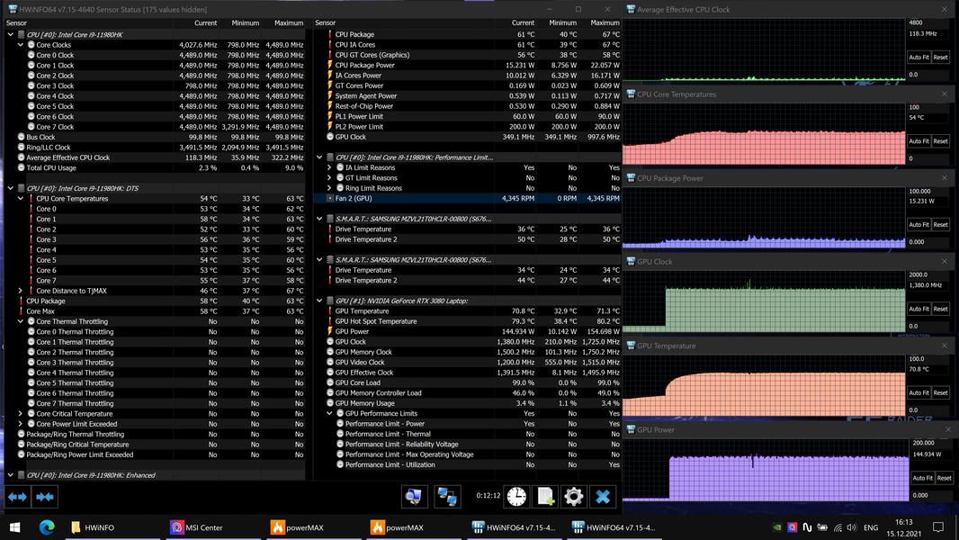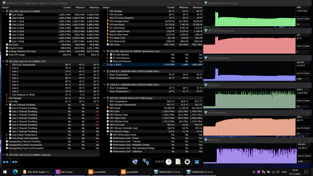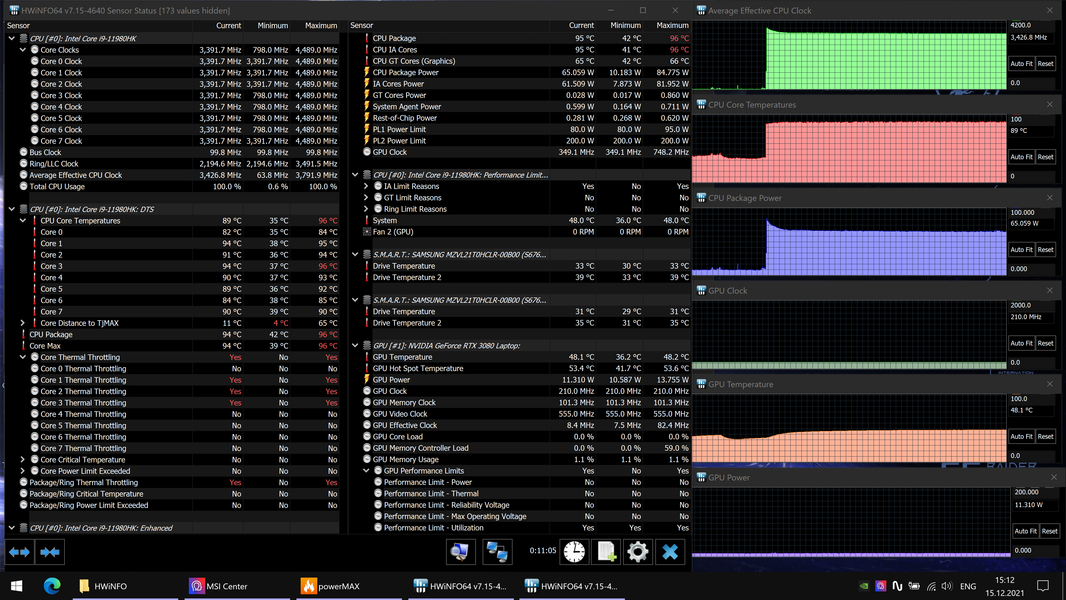 Как видите, в реальных тестах исследуемый ноутбук оказался пусть и немного (на 6%), но медленнее, чем Asus ROG Zephyrus S17 с Intel Core i9-11900H. Разгадка очевидна: Core i9-11980HK в MSI GE76 Raider 11UH работает при максимальном, но штатном TDP 65 Вт, тогда как в ноутбуке Asus процессор потребляет далеко выходящие за рамки приличий TDP 90 Вт. В связи с этим у нас нет претензий ни к MSI, ни к Asus по отдельности (разве что к Intel), но для обычных покупателей сложившаяся в индустрии ситуация плоха тем, что уровень производительности ноутбука нельзя «угадать» по спецификациям, приходится обязательно читать обзоры. Впрочем, это в любом случае полезно.