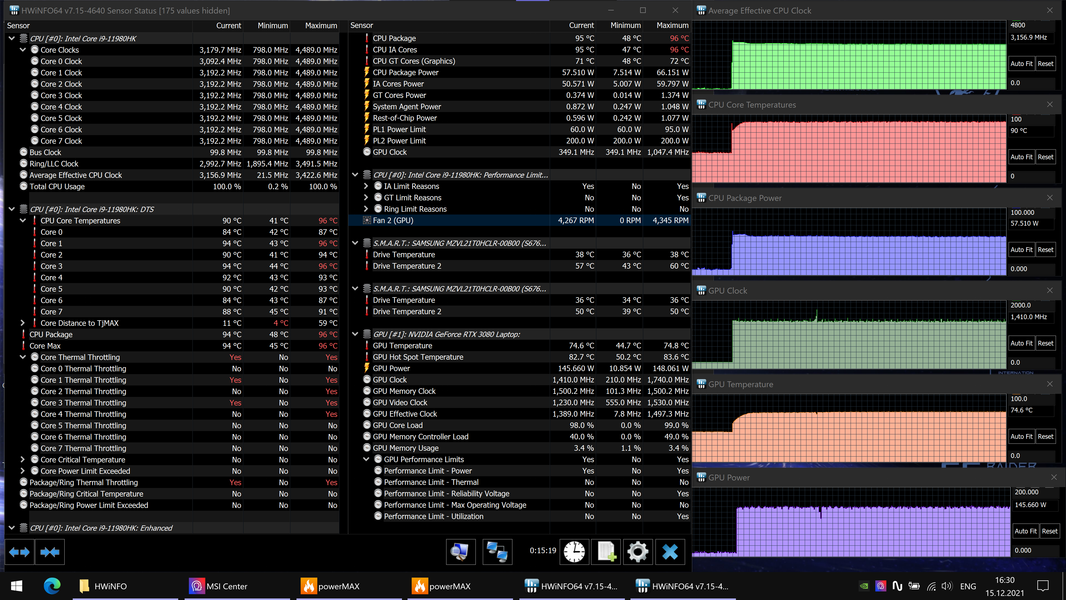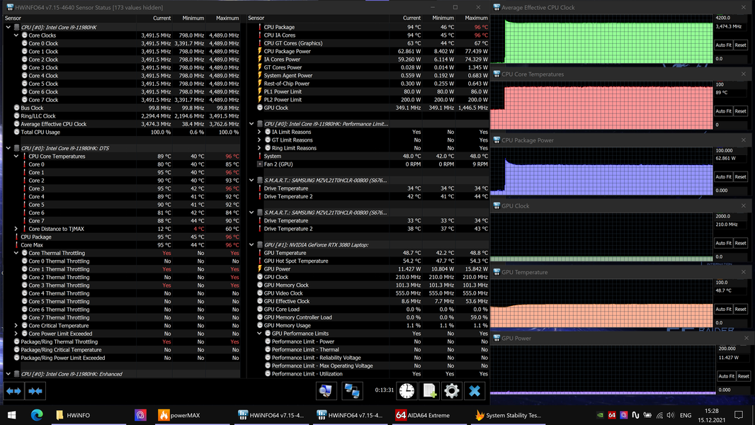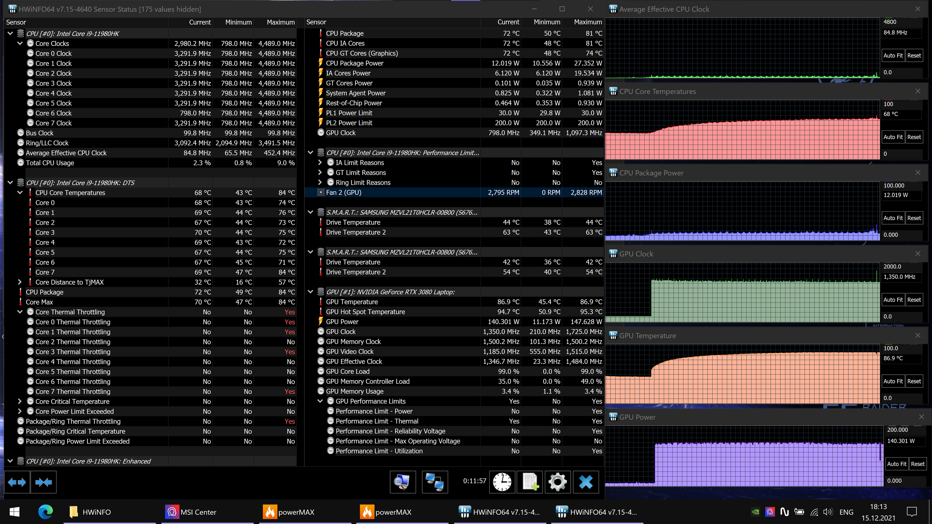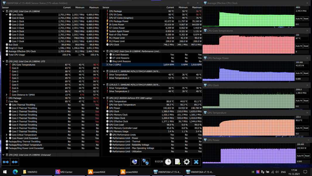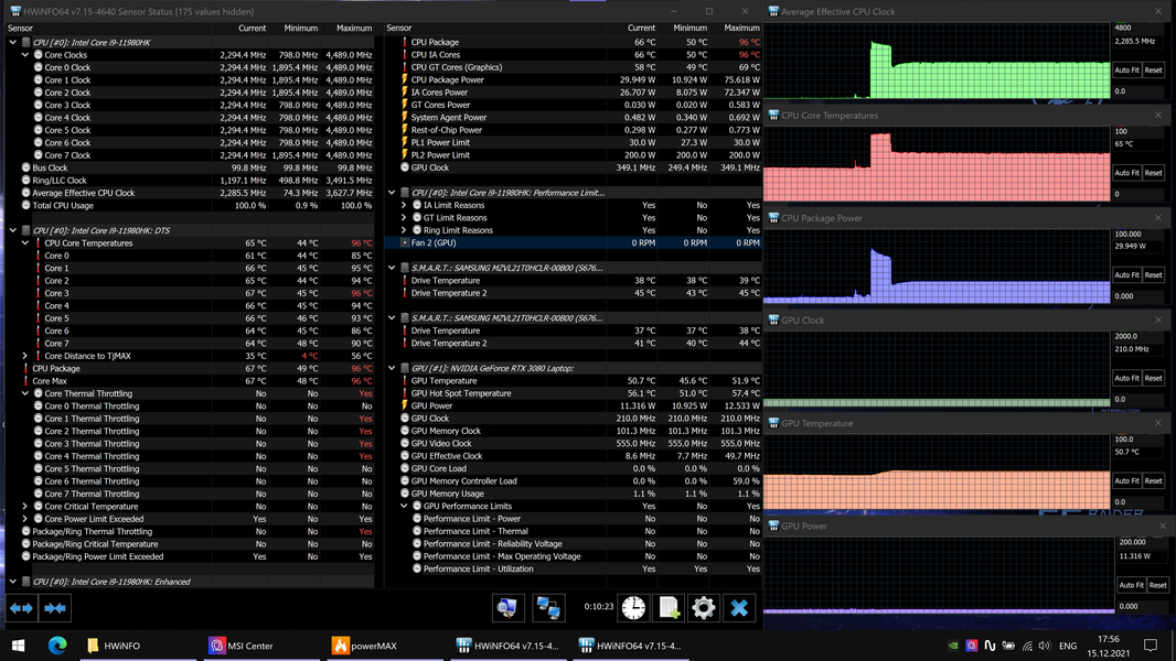 Как видите, в реальных тестах исследуемый ноутбук оказался пусть и немного (на 6%), но медленнее, чем Asus ROG Zephyrus S17 с Intel Core i9-11900H. Разгадка очевидна: Core i9-11980HK в MSI GE76 Raider 11UH работает при максимальном, но штатном TDP 65 Вт, тогда как в ноутбуке Asus процессор потребляет далеко выходящие за рамки приличий TDP 90 Вт. В связи с этим у нас нет претензий ни к MSI, ни к Asus по отдельности (разве что к Intel), но для обычных покупателей сложившаяся в индустрии ситуация плоха тем, что уровень производительности ноутбука нельзя «угадать» по спецификациям, приходится обязательно читать обзоры. Впрочем, это в любом случае полезно.
