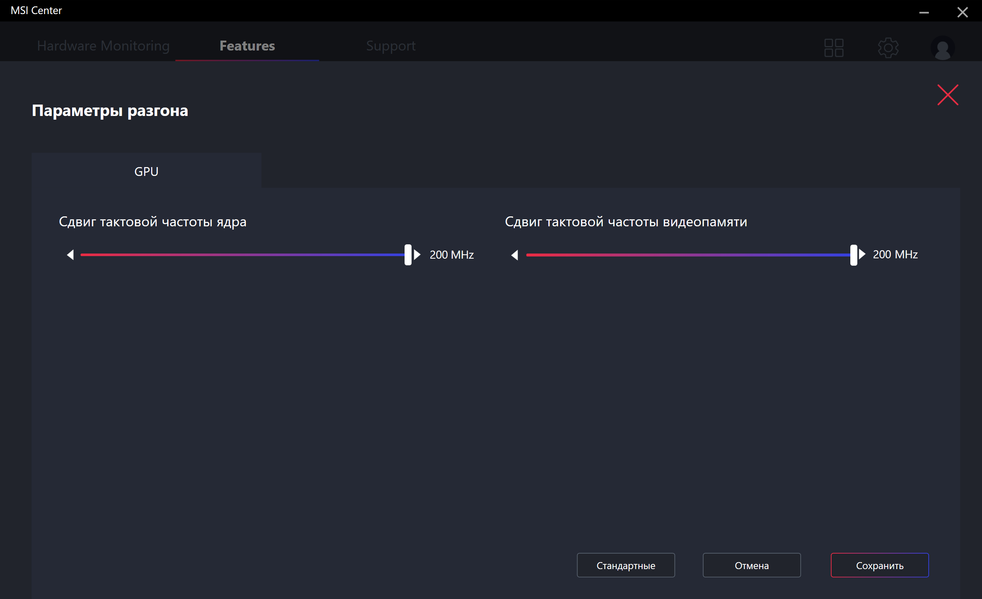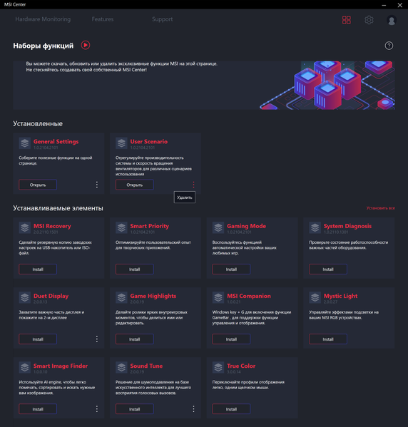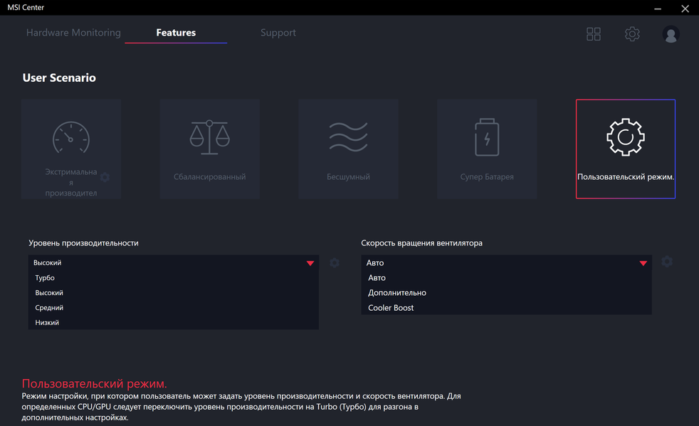 Традиционно, ключевая функция MSI Center — выбор сценария (профиля) работы комплектующих и системы охлаждения. Всего утилита предлагает 4 готовых сценария с очевидными названиями и, за одним исключением, без возможности настройки, а также пользовательский сценарий, в котором можно выбрать желаемый уровень производительности и профиль работы кулеров.