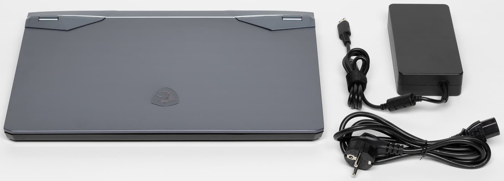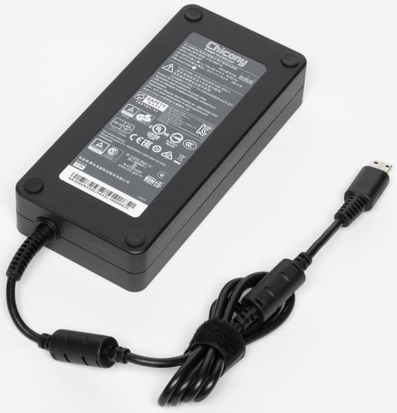 В комплекте с ноутбуком, не считая бумажной документации, можно найти только очень большой и тяжелый (почти 900 г) адаптер питания на 280 Вт с суммарной длиной двух кабелей 3 м.