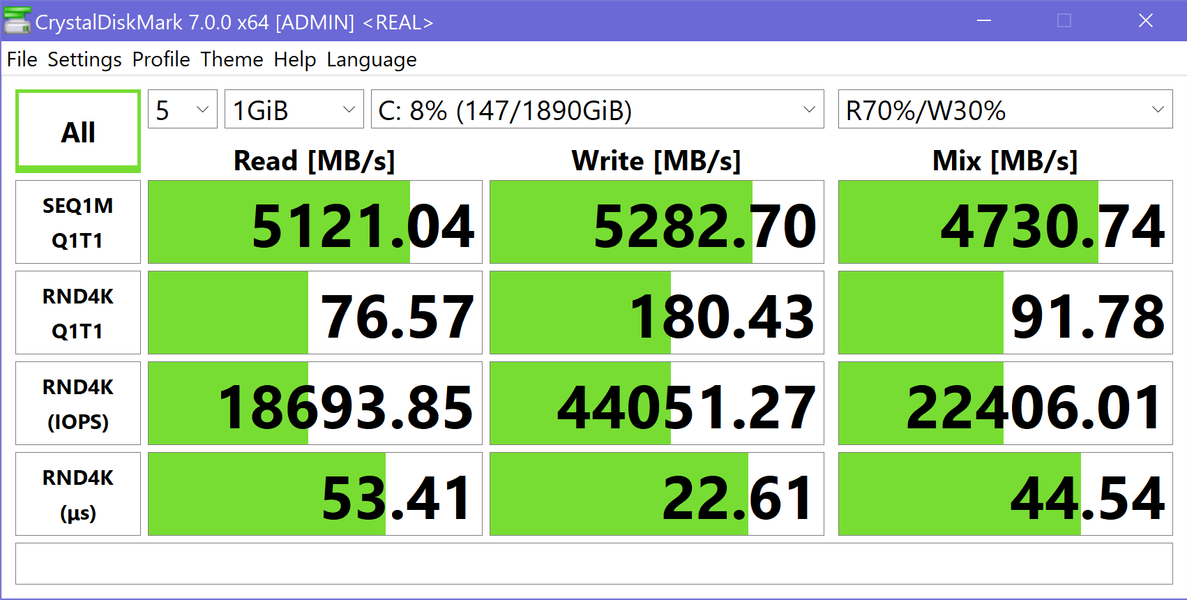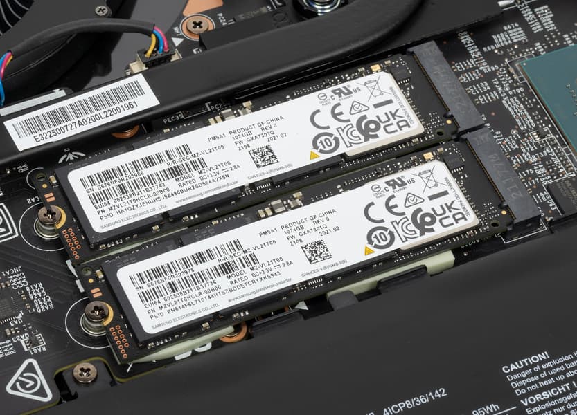В качестве накопителя MSI GE76 Raider 11UH использует типичное для топовых ноутбуков решение: два SSD в массиве RAID0. Массив собран из одинаковых терабайтных NVMe SSD Samsung PM9A1 с интерфейсом PCIe 4.0 x4. В принципе, один слот M.2 ноутбука поддерживает режим PCIe 4.0, однако при работе в составе RAID-массива оба SSD функционируют в режиме PCIe 3.0. Впрочем, скорость работы в пределах кэша у такого RAID-массива все равно очень высокая, хотя и не максимальная: мы уже видели RAID0 из трех очень быстрых SSD.