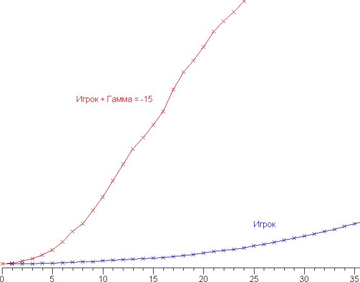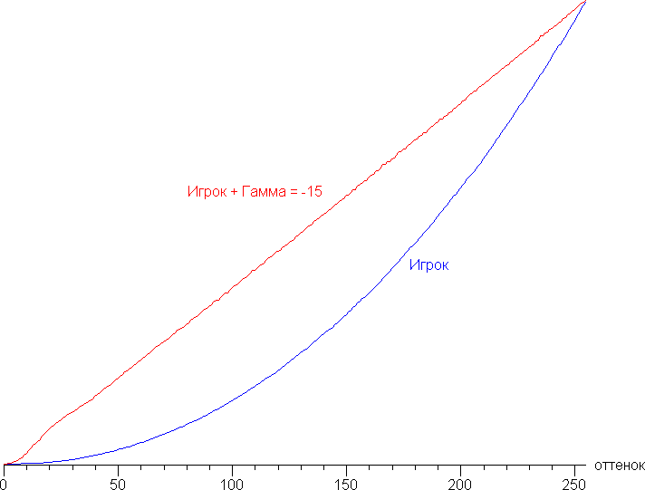 В частности настройкой Гамма можно поднять скорость роста яркости в тенях. Это улучшит различимость деталей в тенях, что, в свою очередь, может улучшить результативность в играх с темными сценами. Для примера приведем гамма-кривую, полученную при минимальном значении этой настройки (−15), которое обеспечивает максимальное осветление: