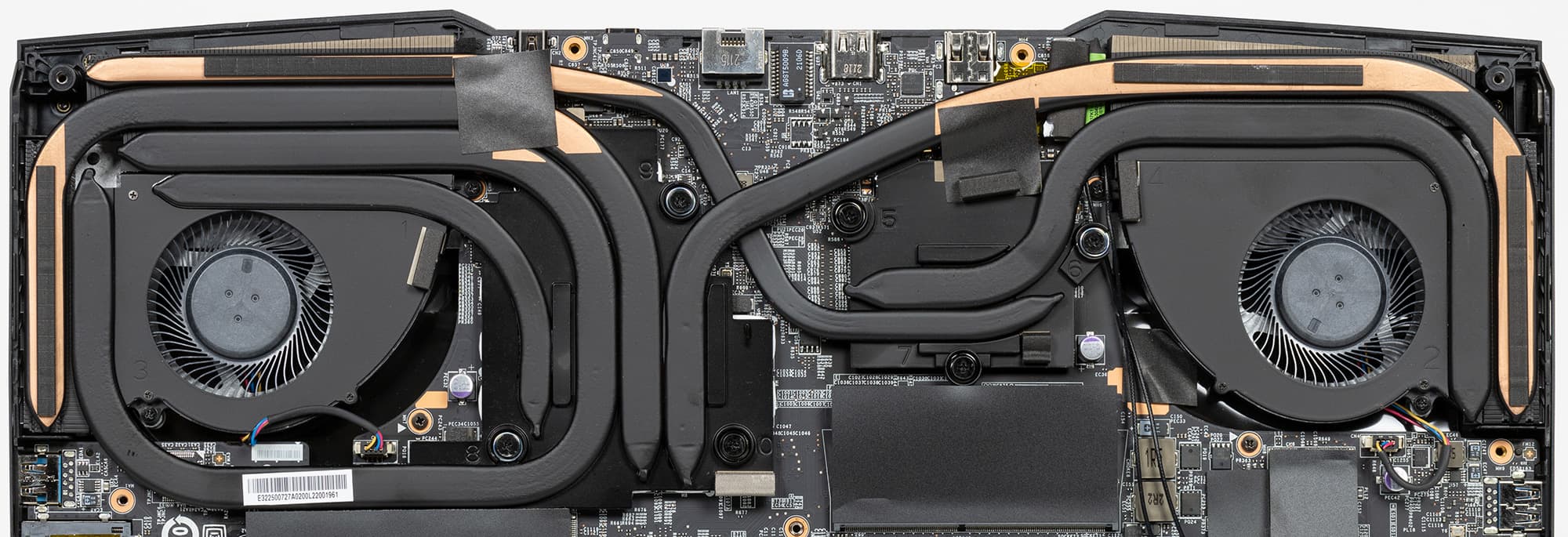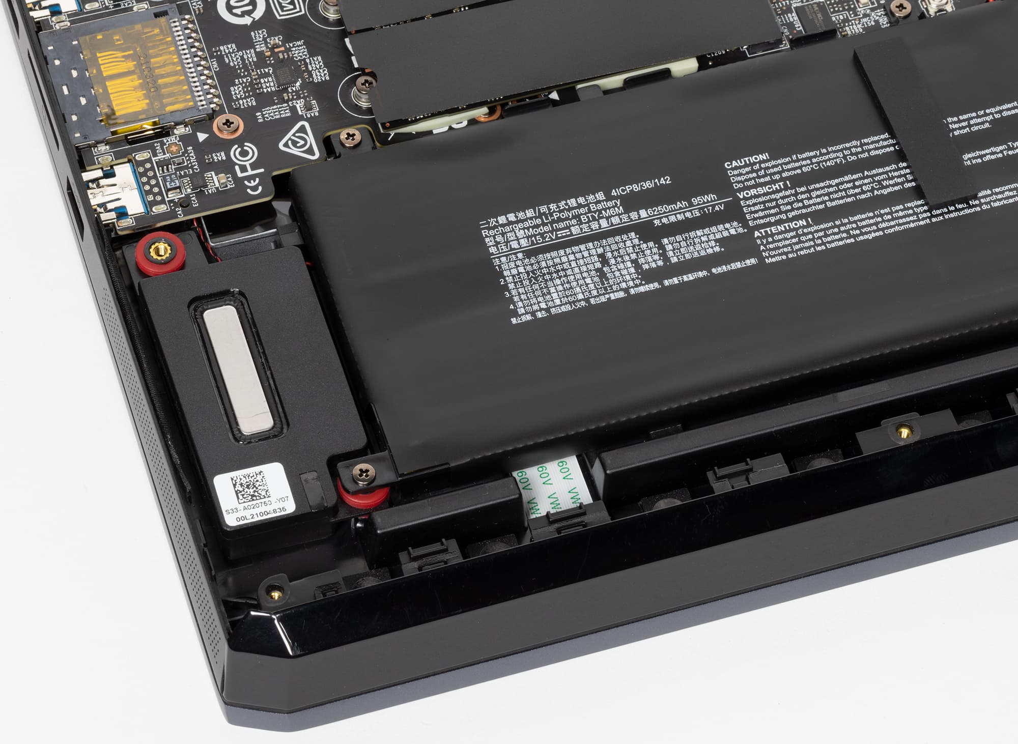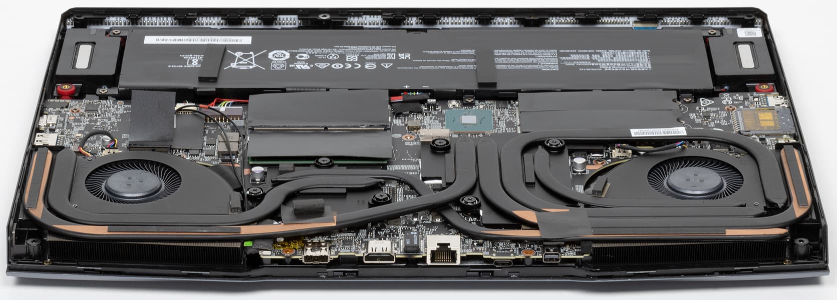 Сняв нижнюю панель корпуса, можно получить доступ к кулерам, батарее, беспроводному сетевому адаптеру, SSD-накопителям в слотах M.2 и модулям памяти в слотах SO-DIMM. Оба слота и в случае M.2, и в случае SO-DIMM у нашего ноутбука были заняты, апгрейд возможен только при замене имеющихся SSD на более емкие или быстрые, а в случае памяти и так установлена максимальная конфигурация.