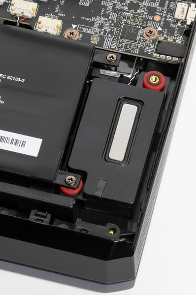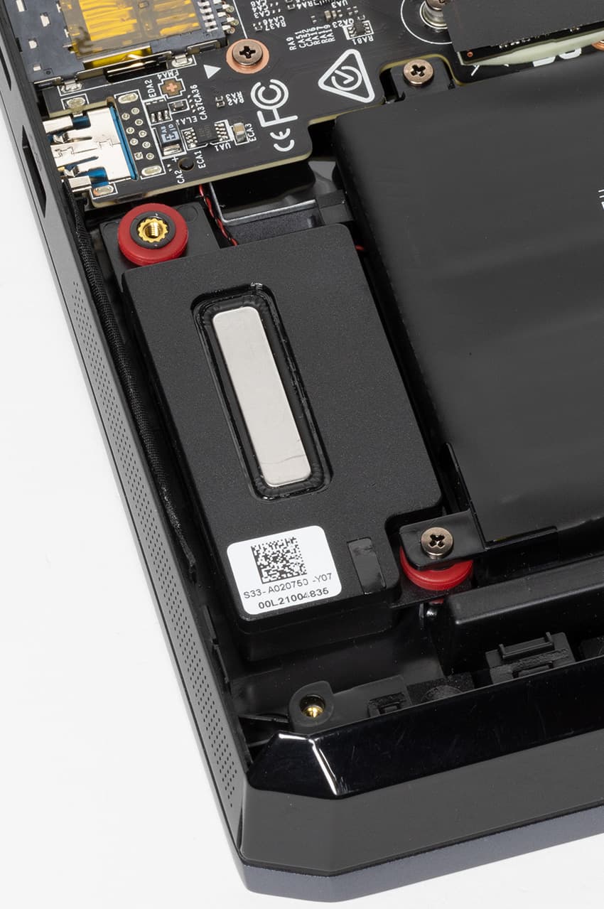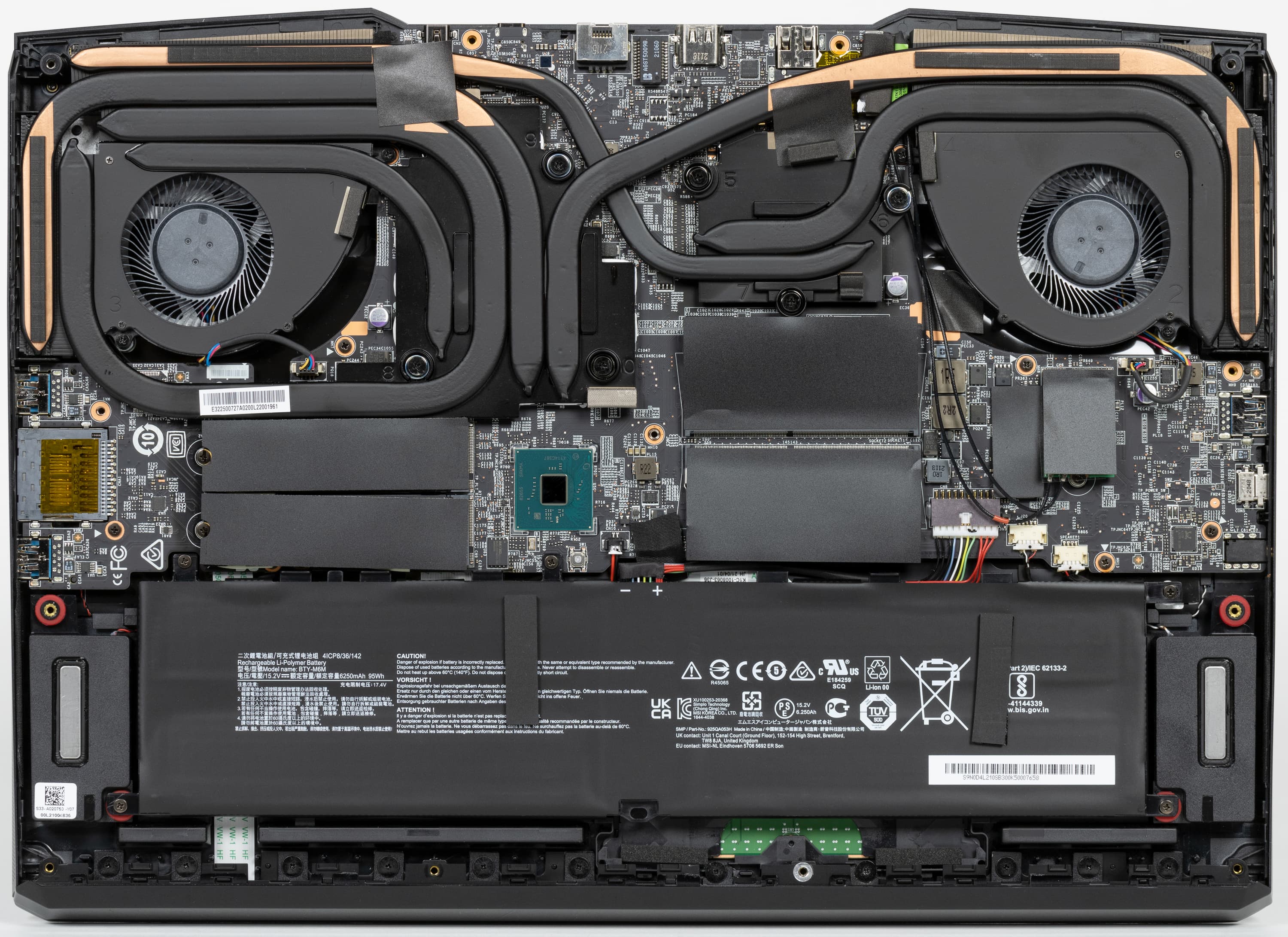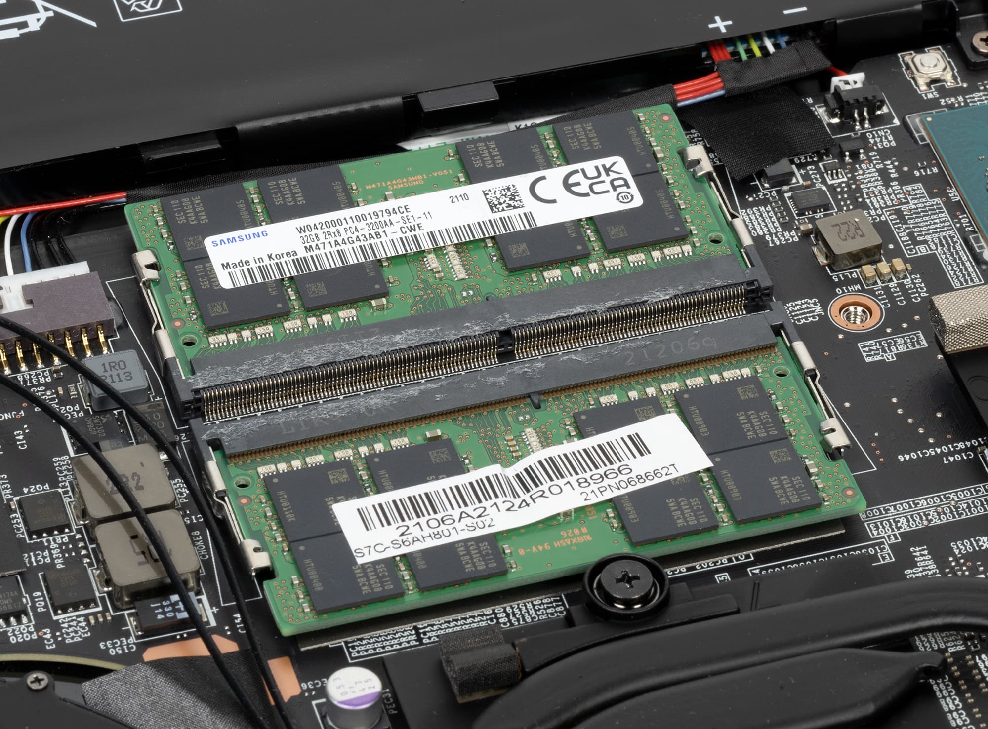 Сняв нижнюю панель корпуса, можно получить доступ к кулерам, батарее, беспроводному сетевому адаптеру, SSD-накопителям в слотах M.2 и модулям памяти в слотах SO-DIMM. Оба слота и в случае M.2, и в случае SO-DIMM у нашего ноутбука были заняты, апгрейд возможен только при замене имеющихся SSD на более емкие или быстрые, а в случае памяти и так установлена максимальная конфигурация.
