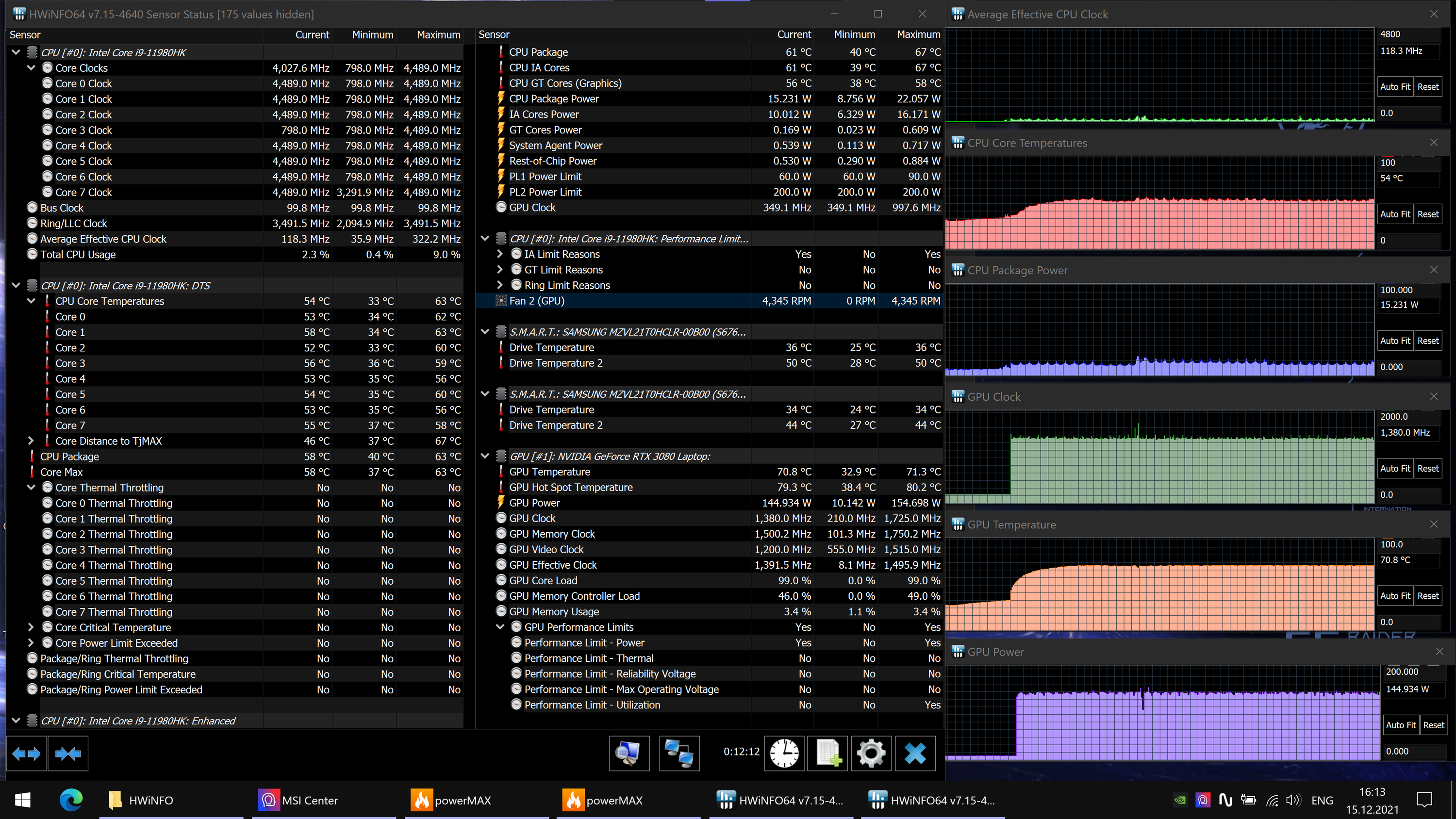 В процессор интегрировано графическое ядро UHD Graphics — младшей версии, с 32 EU. Впрочем, это не имеет никакого значения, поскольку для игр (и приложений, умеющих задействовать GPU), конечно, используется дискретная видеокарта Nvidia GeForce RTX 3080 Laptop. Также в нашей конфигурации ноутбука было установлено 64 ГБ памяти DDR4-3200, работающей в двухканальном режиме (есть и варианты комплектации с 32 ГБ). Это максимальный доступный на сегодняшний день объем (для мобильного рынка вообще).