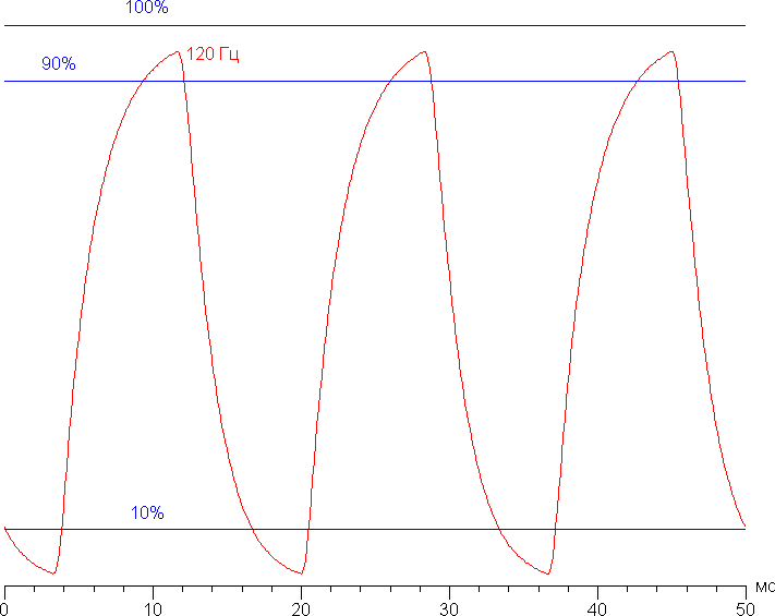 Видно, что при 120 Гц чередования максимальная яркость белого кадра превышает уровень 90% от белого, а минимальная яркость черного кадра ниже 10% от белого. То есть согласно этому формальному критерию скорости матрицы достаточно для полноценного вывода изображения с кадровой частотой 120 Гц.