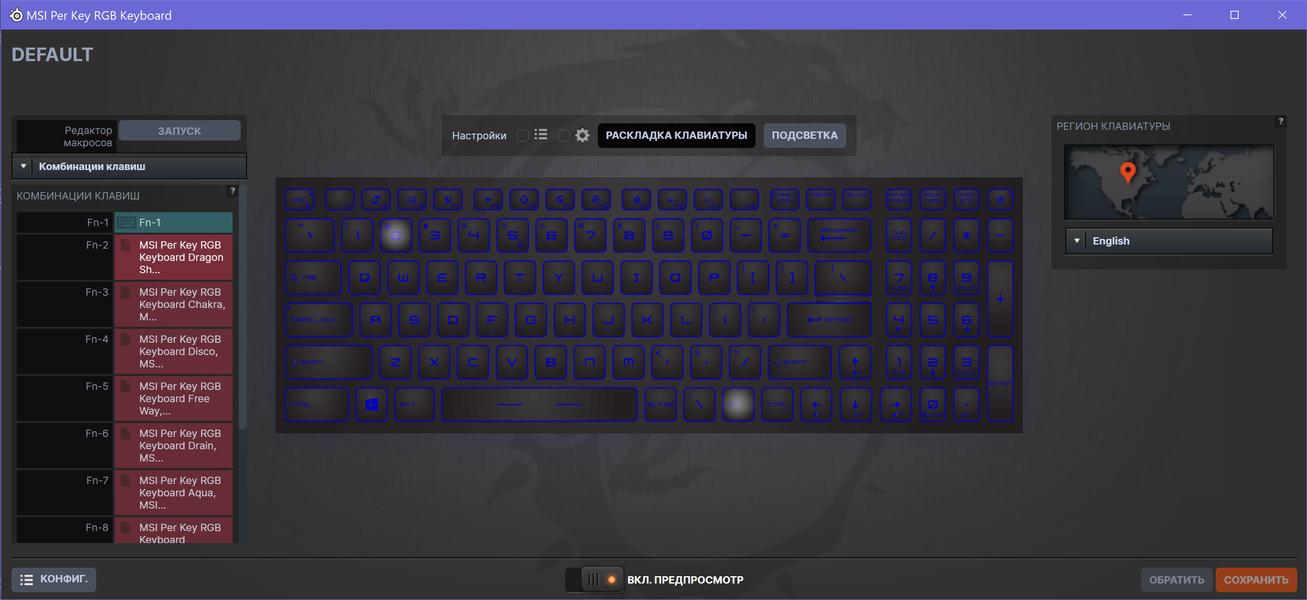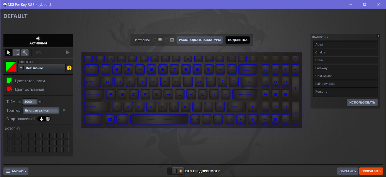 Поскольку все клавиши здесь настраиваются индивидуально, можно создавать очень сложные световые эффекты. Утилита предлагает немало готовых эффектов, которые можно использовать как шаблоны для создания собственных. Также доступно переназначение функций клавиш или «подвешивание» на них макросов. Из готовых эффектов отметим ровное свечение всех клавиш заданным цветом и подсветку только игровых клавиш, актуальных для игр конкретного жанра. В целом, здесь настоящее раздолье для энтузиастов.