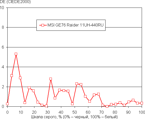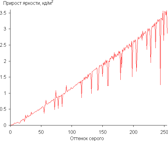 Далее мы измерили яркость 256 оттенков серого (от 0, 0, 0 до 255, 255, 255) при выбранном профиле Игрок. График ниже показывает прирост (не абсолютное значение!) яркости между соседними полутонами: