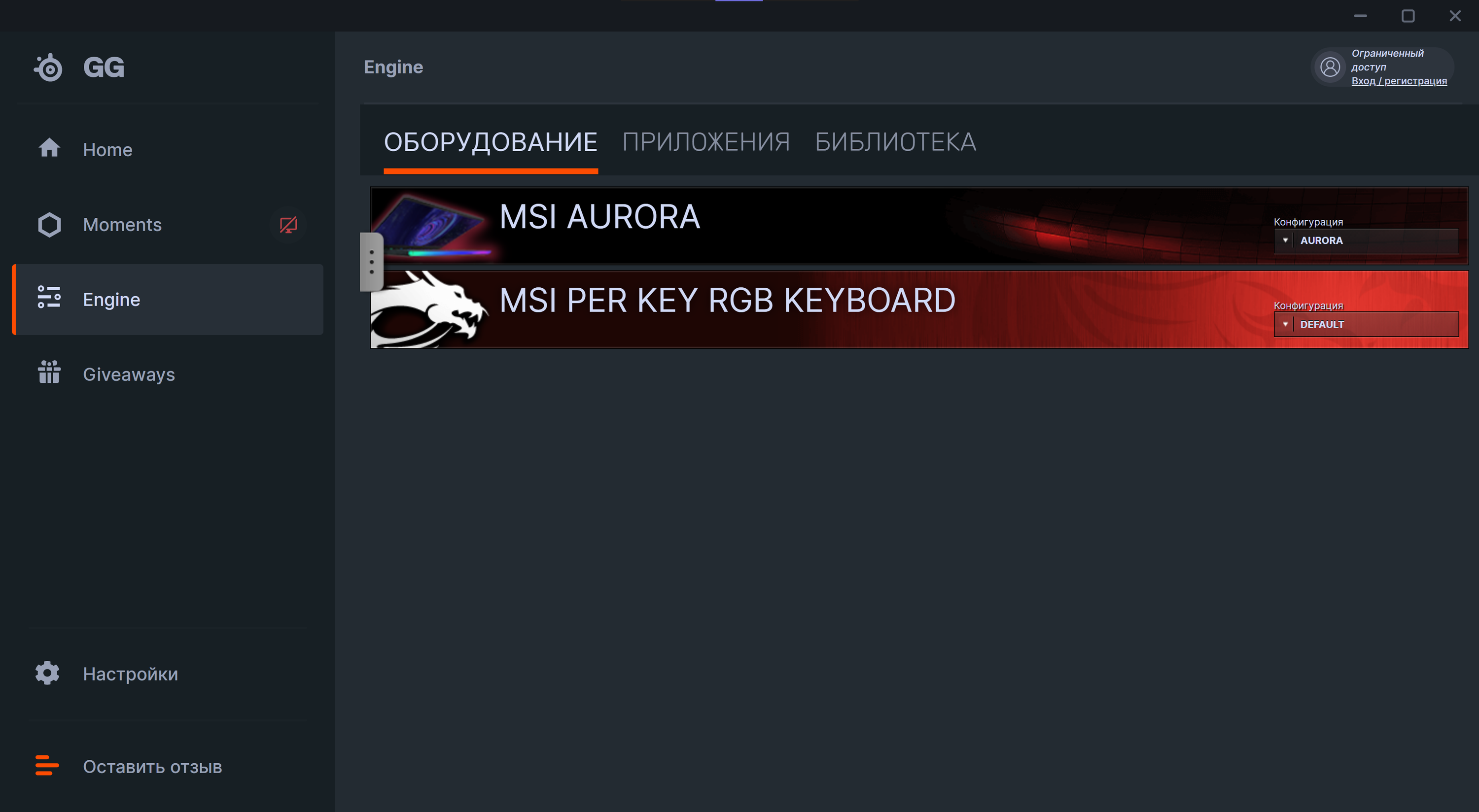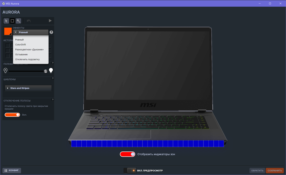 За подсветку клавиатуры и переднего торца ноутбука (он называется MSI Aurora) отвечает не модуль Mystic Light в MSI Center, а утилита производителя клавиатуры — SteelSeries Engine 3.