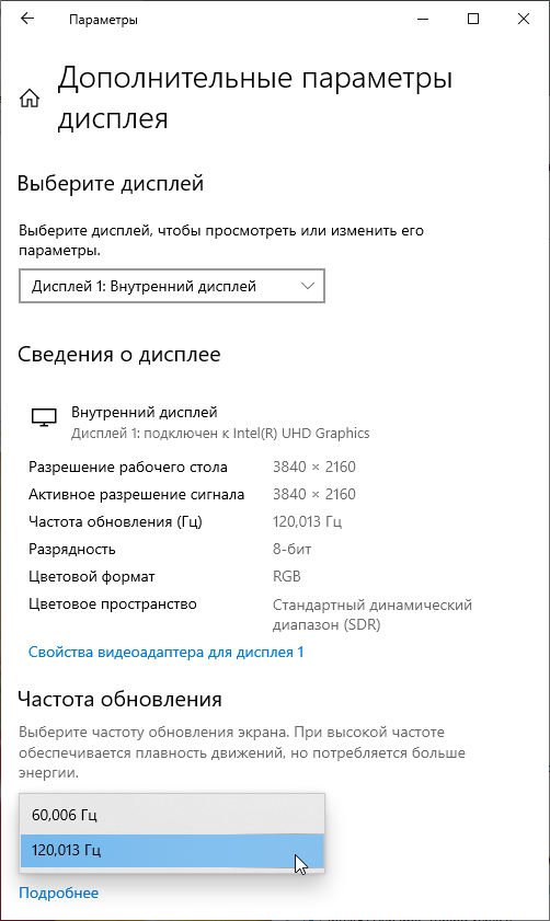 В настройках экрана на выбор доступны две частоты обновления — 60 и 120 Гц.