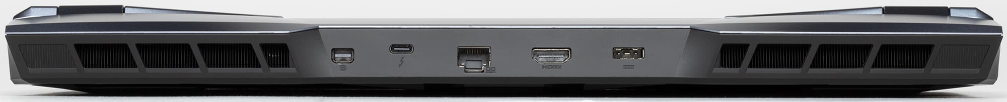 Большой корпус — это еще и много портов. Спереди у ноутбука ничего нет (там располагается большой световод системы подсветки). На задней стороне корпуса, между вентиляционных отверстий, располагаются видеовыходы: Mini-DisplayPort, Thunderbolt 4 и HDMI. Все они поддерживают вывод изображения до 8K. Порт Thunderbolt 4 можно, конечно, использовать и в качестве USB3 Type-C. Также сзади есть сетевая розетка (RJ-45) 2,5-гигабитной сети и симметричный разъем питания (штекер можно вставлять любой стороной).
