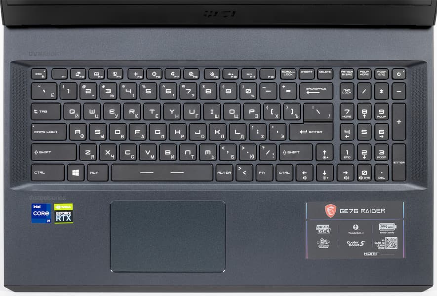 Согласно информации на российском сайте MSI, на момент подготовки нашего обзора модель GE76 Raider предлагалась в России в нескольких модификациях: несколько вариантов процессоров, разный объем памяти и конфигурация накопителей, вся линейка видеокарт Nvidia, 4 варианта экрана… Перечислять это в деталях слишком долго, так что мы приводим в таблице спецификации только попавшей к нам на тест модели.