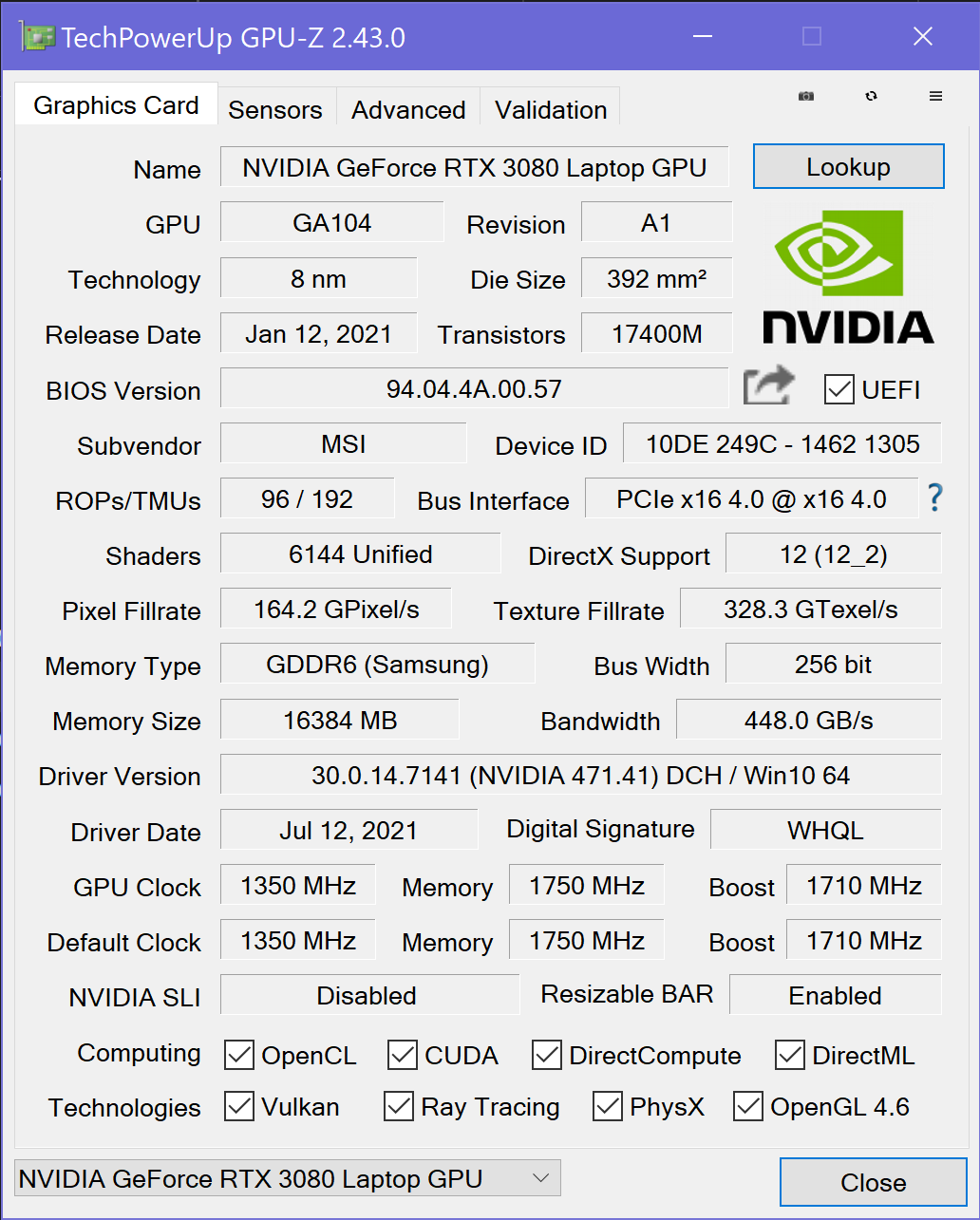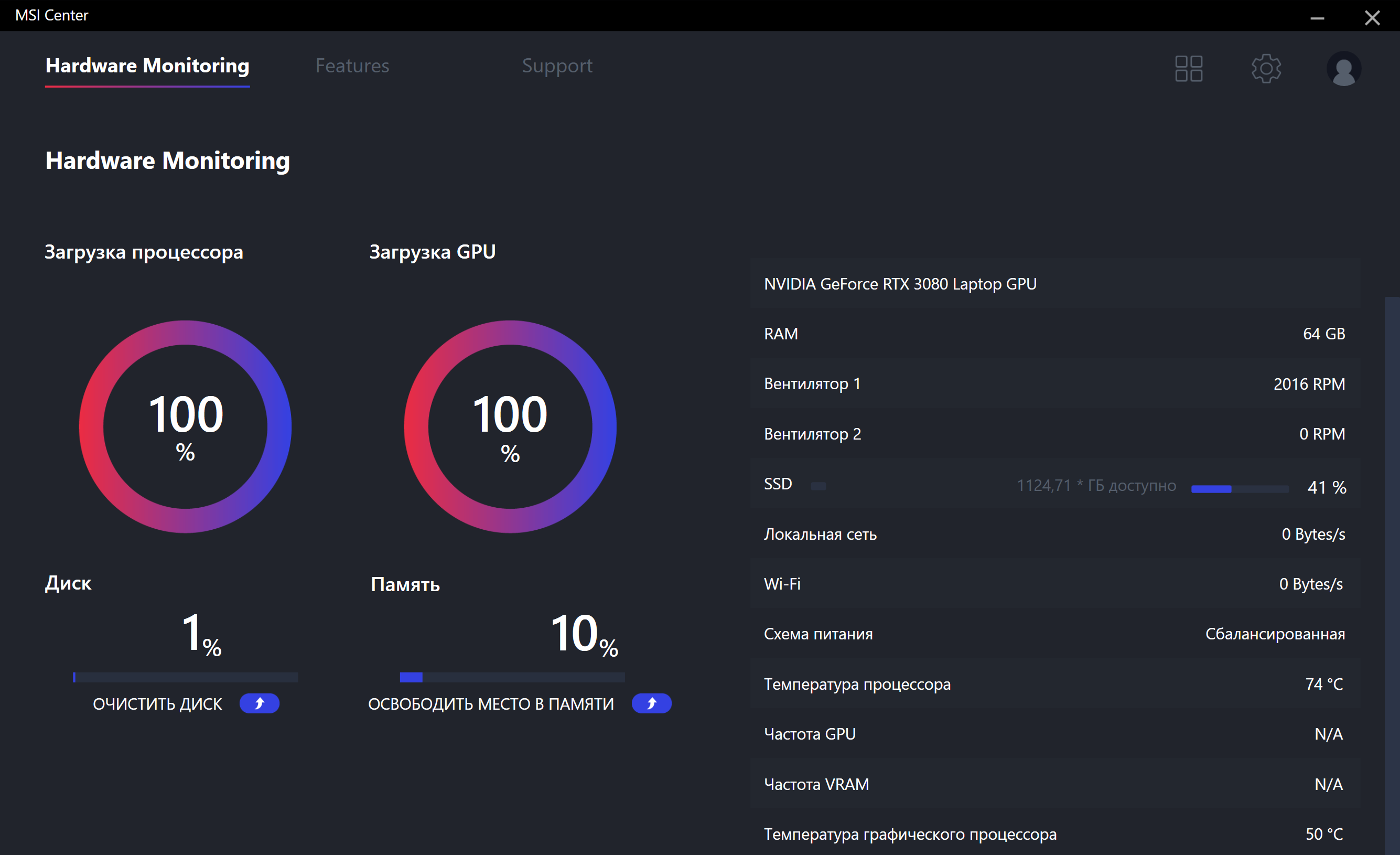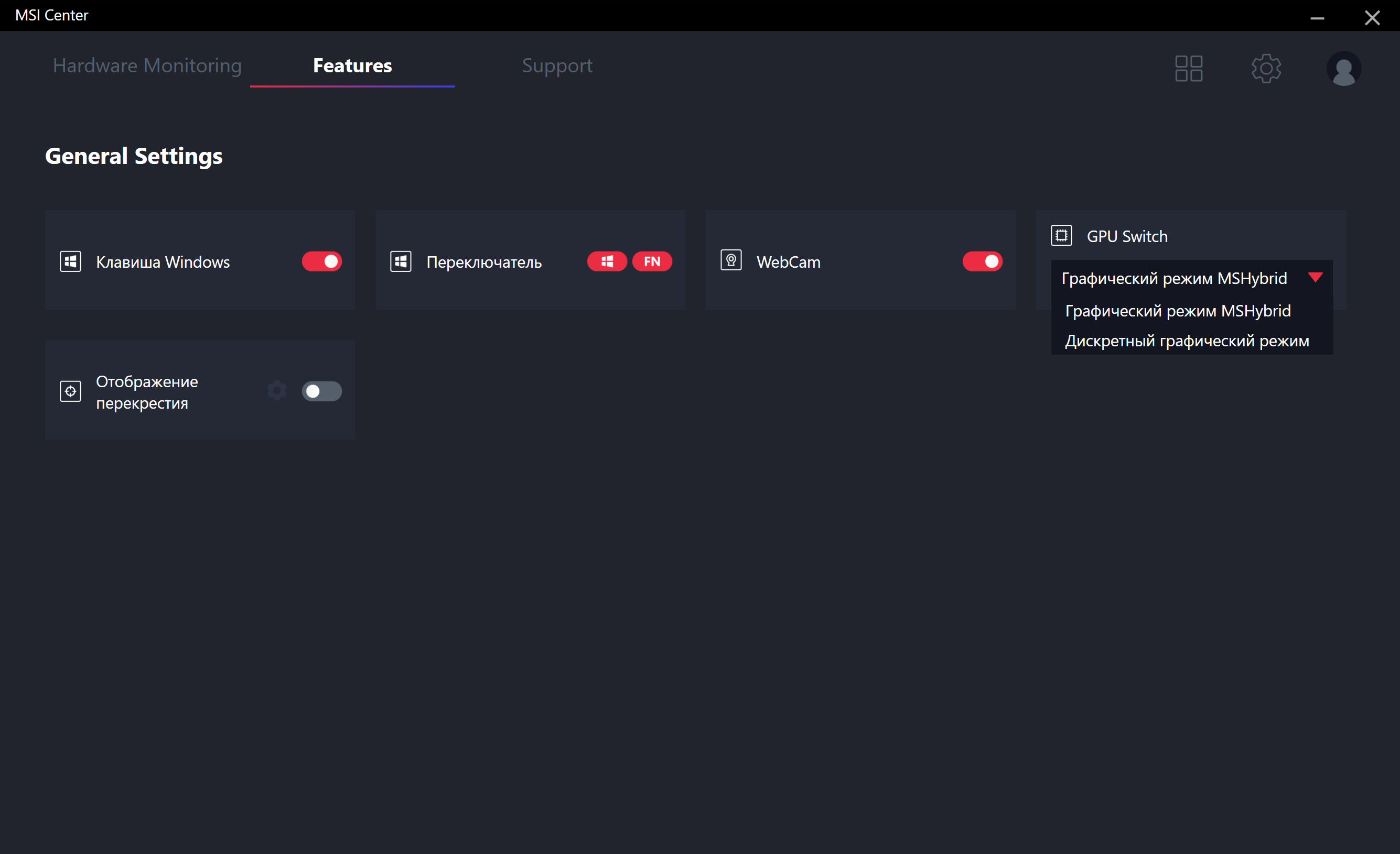 Тестирование ноутбука в играх мы проведем с использованием его дискретной видеокарты Nvidia GeForce RTX 3080 Laptop из последнего поколения на архитектуре Ampere, анонсированного в начале 2021 года. Nvidia заявляет для этих моделей только диапазон возможных рабочих характеристик, а параметры работы видеокарты в конкретном ноутбуке определяются его создателем. Так, на сайте Nvidia для GeForce RTX 3080 Laptop заявлены Boost-частоты от 1245 до 1710 МГц и потребление 80—150 Вт (и более). MSI же перекрывает эти обещания: до 1800 МГц и до 165 Вт. Это очень высокие цифры; для сравнения, топовый игровой ноутбук Asus ROG Zephyrus S17 с такой же видеокартой обещает лишь 1645 МГц и 125 Вт (с динамическим разгоном до 140 Вт). Правда, в реальном тестировании под нагрузкой мы 165 Вт в сколько-нибудь долгосрочном периоде у MSI не видели, однако потребление все-таки было немного выше, чем у упомянутого ноутбука Asus. У карты 16 ГБ памяти GDDR6 с 256-битной шиной — это максимальный возможный объем на сегодняшний день. В настройках фирменной утилиты MSI Center можно включить использование только дискретной видеокарты или гибридный режим (Nvidia Optimus).