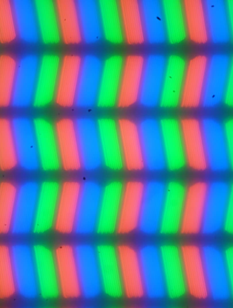 В этом ноутбуке используется матрица типа IPS. Микрофотографии демонстрируют типичную для IPS структуру субпикселей (черные точки — это пыль на матрице фотоаппарата):