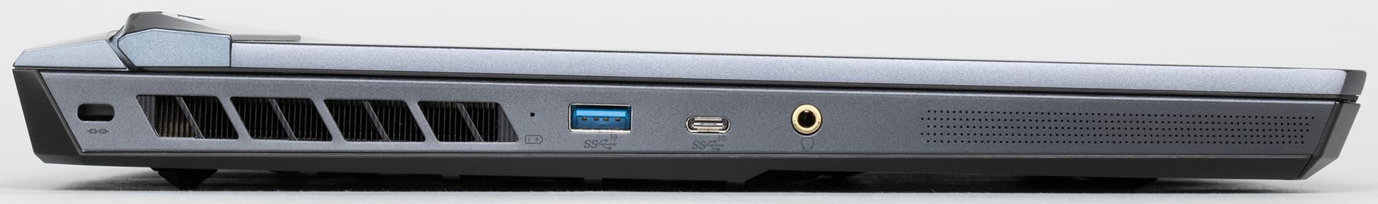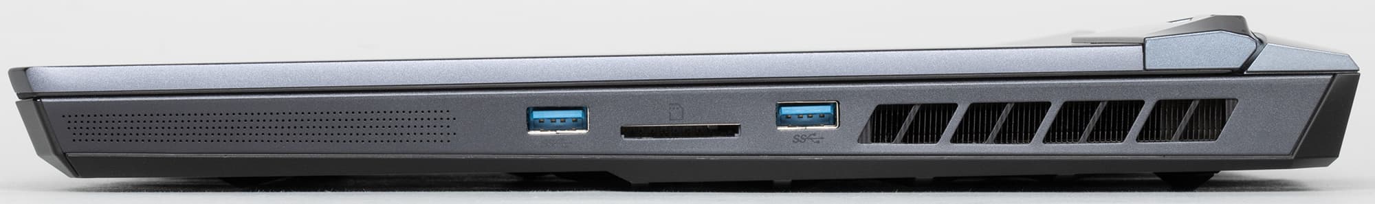 Слева есть отверстие кенсингтонского замка, а по другую сторону вентиляционной решетки — USB3 Gen2 Type-A, USB3 Gen2 Type-C и универсальный миниджек для наушников или гарнитуры. В передней части боковин есть отверстия для выхода звука из стереодинамиков. Справа есть еще одна вентиляционная решетка, 2 порта USB3 Gen1 Type-A, а между ними — картовод SDexpress.