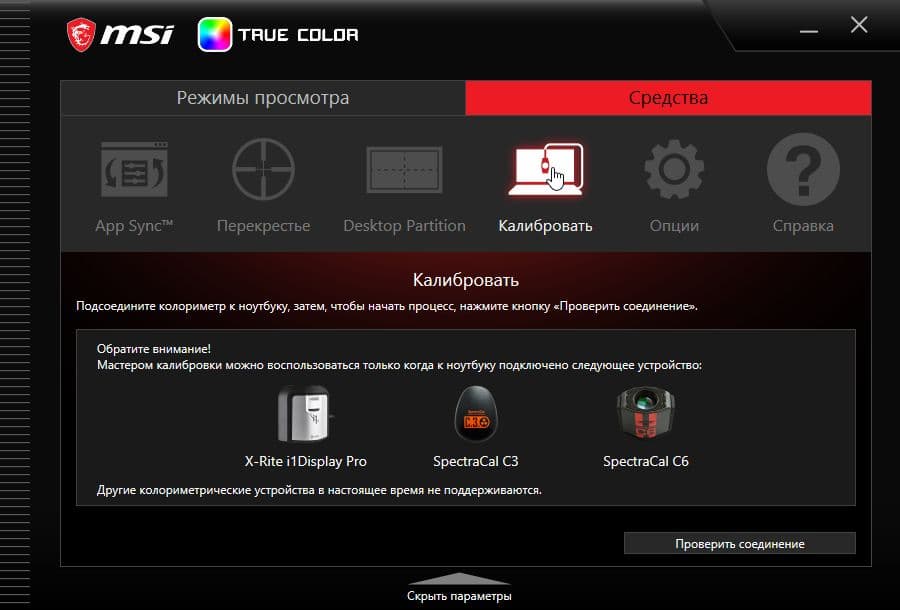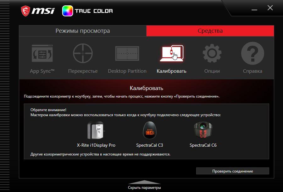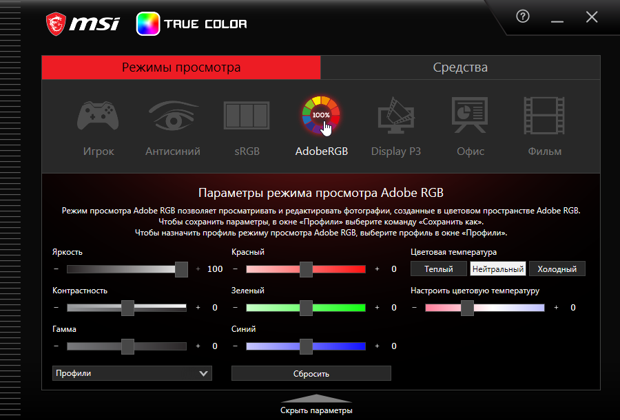 Присутствует фирменная утилита True Color, с помощью которой можно изменить ряд настроек экрана. Доступность настроек зависит от выбранного профиля: