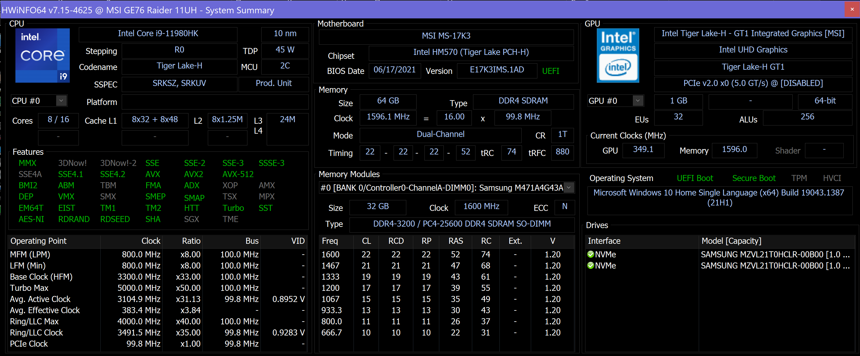 В ноутбуке используется 8-ядерный (16-поточный) самый топовый процессор Intel Core i9-11980HK пока еще последнего мобильного поколения (11-го, Tiger Lake). Если сравнить, например, с Core i9-11900H, на котором мы недавно тестировали ноутбук Asus ROG Zephyrus S17, то они практически идентичны, но у Core i9-11980HK выше частота, пусть и на символические 100 МГц: 2,6/5,0 ГГц против 2,5/4,9 ГГц. Важнее, однако, условия, при которых достигаются эти частоты и вообще работают процессоры. Потребление Core i9-11900H может быть сконфигурировано в диапазоне 35—45 Вт, и 2,5 ГГц — его базовая частота в максимальном режиме, при потреблении 45 Вт. У Core i9-11980HK же конфигурируемый диапазон TDP составляет 45—65 Вт, и частота 2,6 ГГц достигается в младшем режиме, при том же потреблении 45 Вт (при 65 Вт она составляет 3,3 ГГц). Вопрос о том, какой из процессоров быстрее, думается, не стои́т. Однако безусловно это справедливо только для сферических процессоров в вакууме, а какой из двух этих ноутбуков будет быстрее на практике? Продолжайте читать.