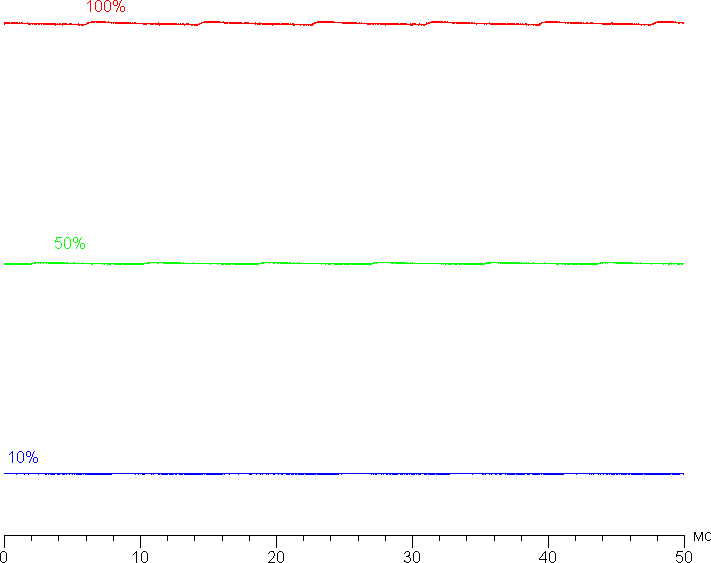 На любом уровне яркости значимая модуляция подсветки отсутствует, поэтому нет и никакого мерцания экрана. В доказательство приведем графики зависимости яркости (вертикальная ось) от времени (горизонтальная ось) при различных значениях настройки яркости: