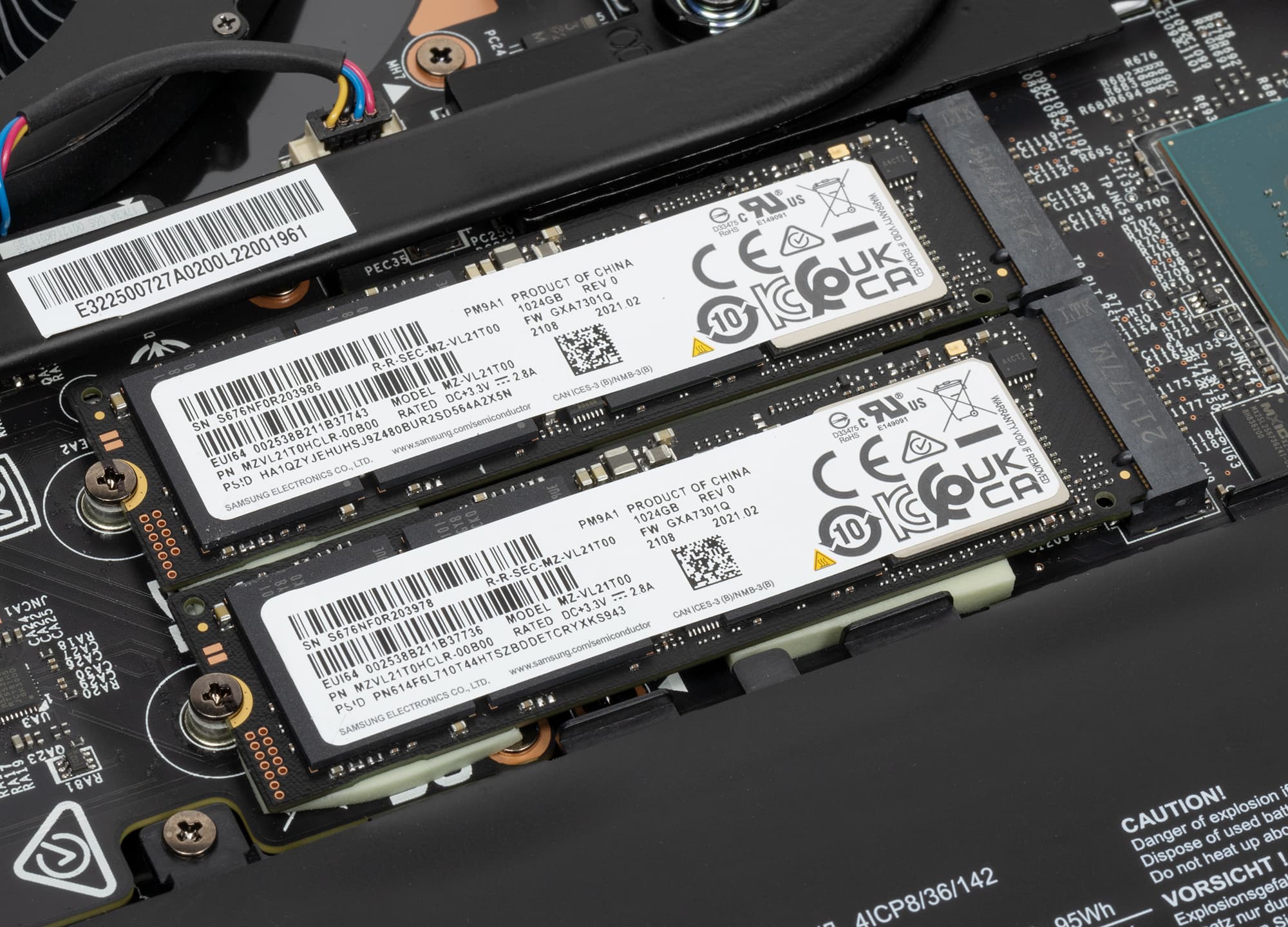 Надо обязательно оговориться, что RAID 0 — ненадежный накопитель в смысле гарантии сохранности пользовательских данных, так что если ноутбук станет использоваться не только для игр (их данные-то как раз сохраняются в облако на всех современных платформах), то нужно непременно продумать вопрос с бэкапами. Кроме того отметим, что у ноутбука всего два слота M.2, и у тестируемой нами конфигурации они, понятно, оба заняты, так что добавить еще один накопитель не получится, а при апгрейде имеющихся придется «разваливать» RAID-массив с системой.