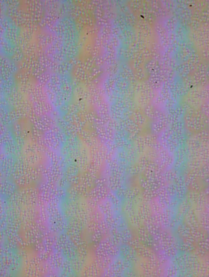 Зерно этих дефектов в несколько раз меньше размеров субпикселей (масштаб этих двух фотографий примерно одинаковый), поэтому фокусировка на микродефектах и «перескок» фокуса по субпикселям при изменении угла зрения выражены слабо, из-за этого нет и «кристаллического» эффекта.