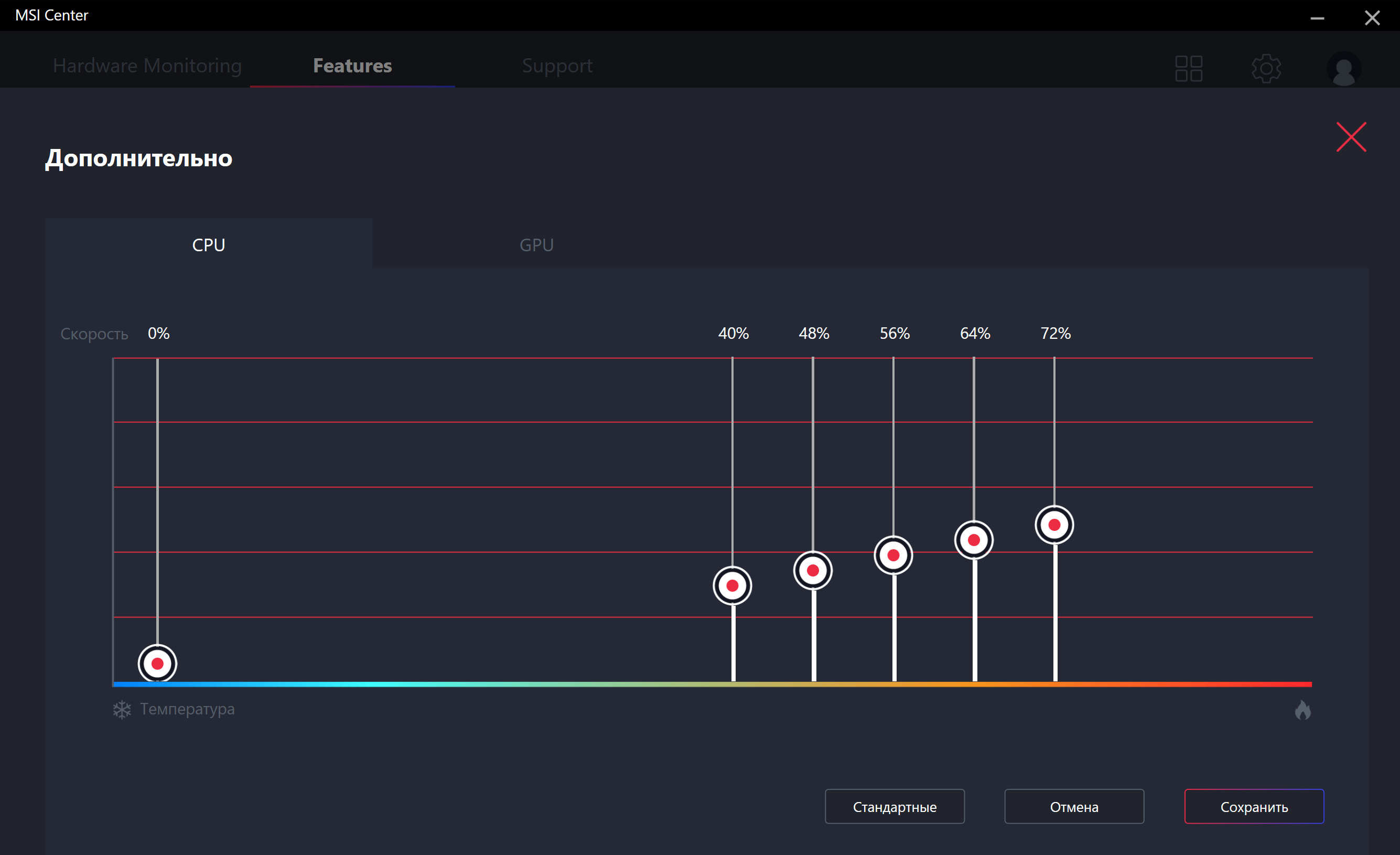 При выборе уровня производительности Turbo для пользовательского сценария и в сценарии Extreme Performance можно дополнительно разогнать видеокарту, подняв частоту ядра и памяти на 200 МГц. Только в пользовательском сценарии и в сценарии максимальной производительности можно выбрать максимальный режим работы кулеров — Cooler Boost. Впрочем, шум в нем очень высокий, неумышленно Cooler Boost не включишь. Также только в пользовательском сценарии можно выбрать и настроить продвинутый режим работы кулеров: задать кривую скорости вращения вентилятора (отдельно для кулеров CPU и GPU) по шести точкам с условной степенью нагрева. Подробнее о штатных сценариях мы поговорим в разделе тестирования под нагрузкой. Быстро включить режим охлаждения Cooler Boost можно без запуска утилиты, нажатием Fn+F8.