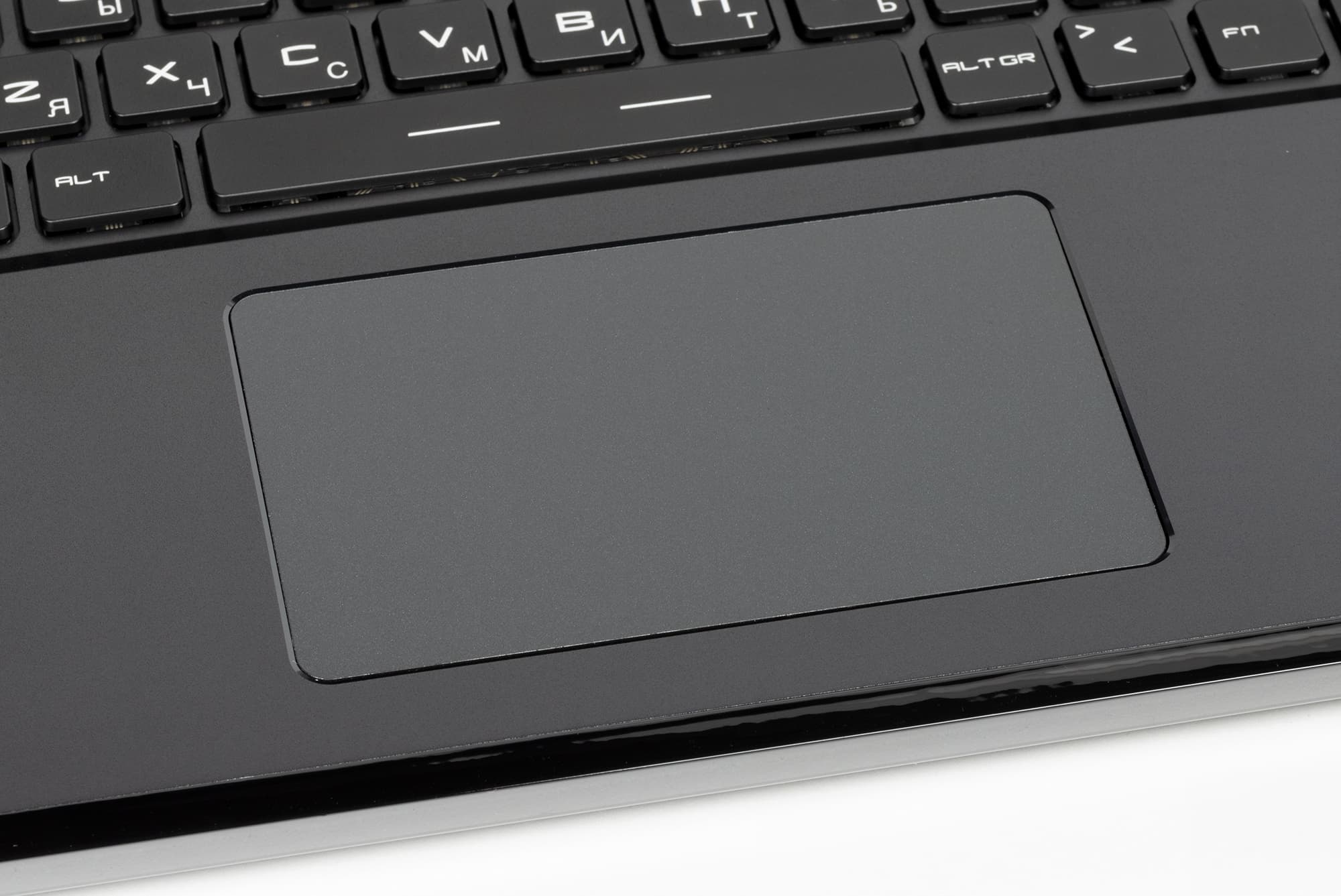 Тачпад для столь крупного ноутбука выглядит совсем маленьким (105×65 мм), тогда как сейчас тачпады, наоборот, стараются делать максимально большими. Впрочем, четыре пальца для горизонтальных взмахов на нем помещаются без проблем. У тачпада нет выделенных клавиш, но сенсорная площадка поддерживает нажатия (нажатие в правой половине у самого ближнего края соответствует нажатию правой кнопки мыши). Усилие нажатия сильно неравномерное: вблизи — мягкое, в середине — упругое, а дальний край не нажимается вовсе. Из-за этого (и из-за не слишком большой площади сенсорной поверхности) работать с нажатиями одной рукой, например выделяя и перетаскивая файлы, неудобно. Видимо, пора окончательно переучиваться на работу с касаниями.