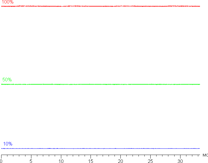 На любом уровне яркости значимая модуляция подсветки отсутствует, поэтому нет и никакого мерцания экрана. В доказательство приведем графики зависимости яркости (вертикальная ось) от времени (горизонтальная ось) при различных значениях настройки яркости: