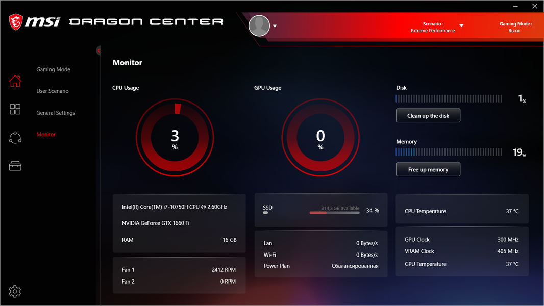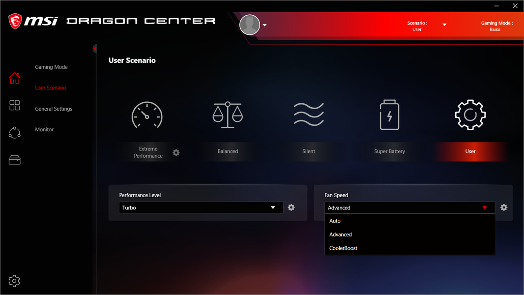 Главная фирменная утилита в данном случае называется Dragon Center, и главная ее функция — выбор сценария (как это здесь названо) работы комплектующих и системы охлаждения. Всего утилита предлагает 4 готовых сценария с очевидными названиями и, за одним исключением, без возможности настройки, а также пользовательский сценарий, в котором можно выбрать желаемый уровень производительности и профиль работы кулеров. В частности, только в пользовательском сценарии и в сценарии максимальной производительности можно выбрать максимальный режим работы кулеров — Cooler Boost. Впрочем, шум от него настолько высокий, что вряд ли кто-то захочет выбрать его в качестве долговременного.