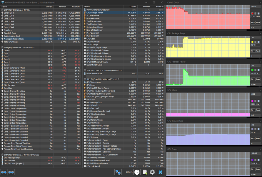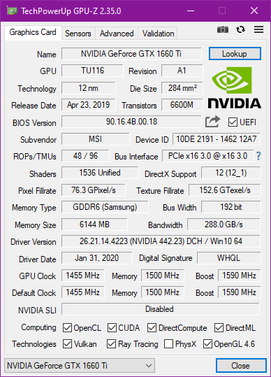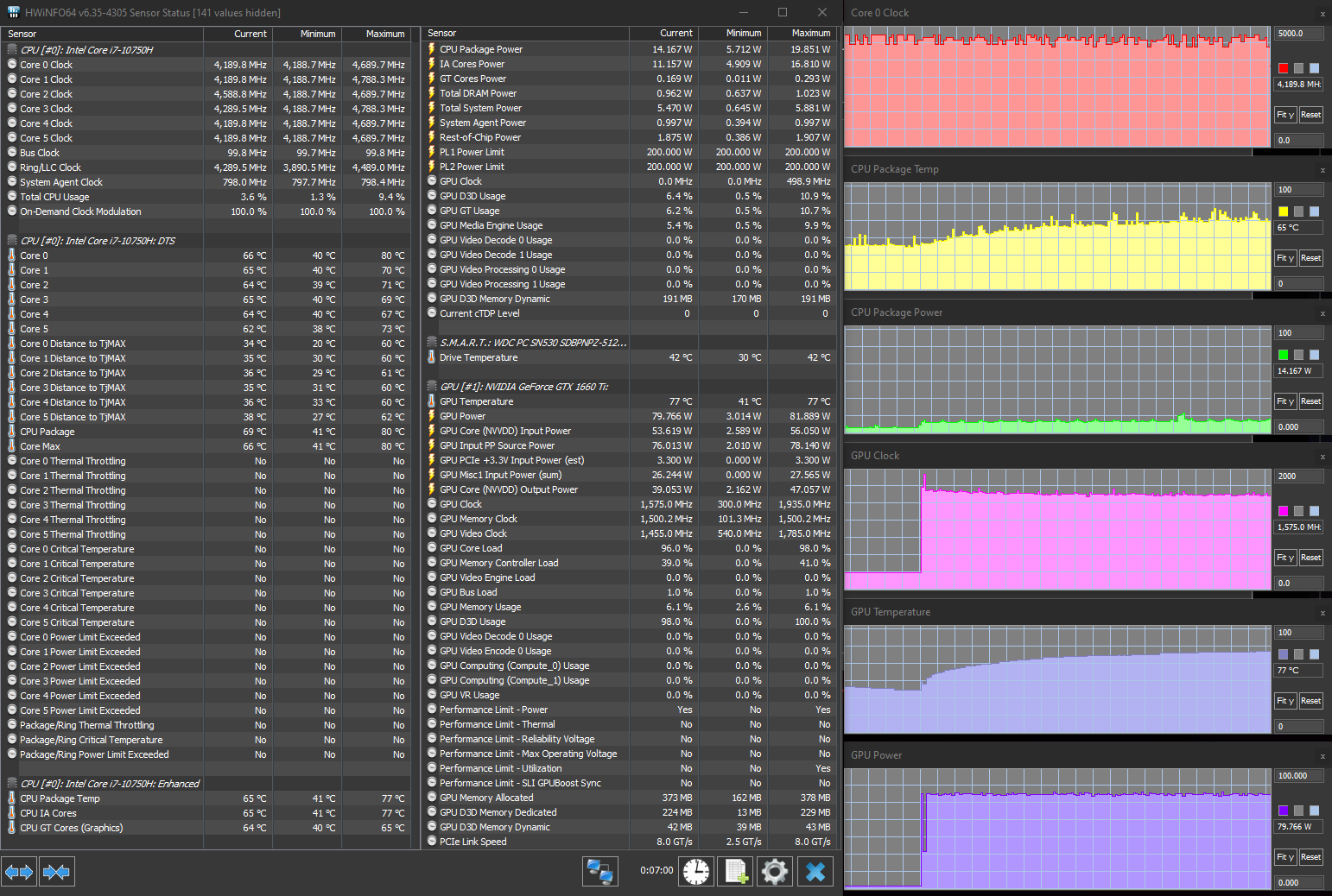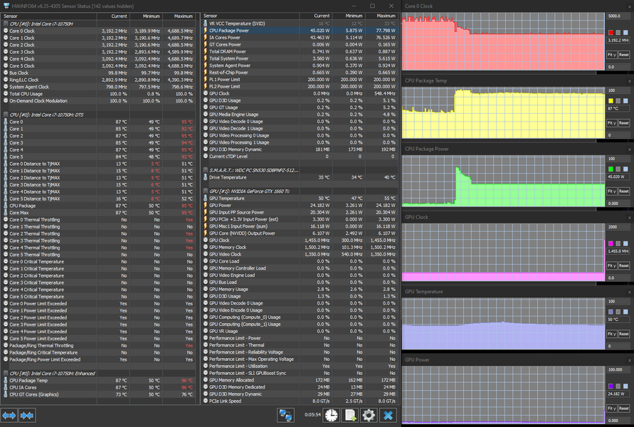 Интегрированная графика процессора Intel в данном случае нас не заинтересовала, поскольку в ноутбуке установлена дискретная игровая видеокарта среднего уровня Nvidia GeForce GTX 1660 Ti с 6 ГБ GDDR6. Низкоуровневые параметры этого ускорителя представлены на скриншоте, мы же по итогам тестирования можем подтвердить, что он штатно работал при потреблении 80 Вт — в том числе, игнорируя перегрев соседнего процессора.