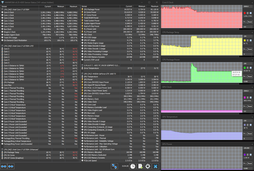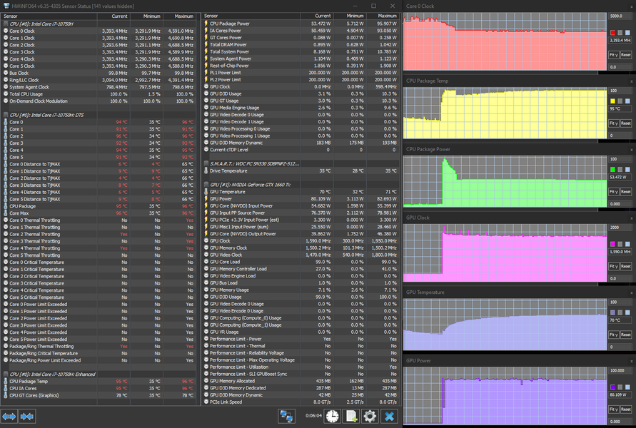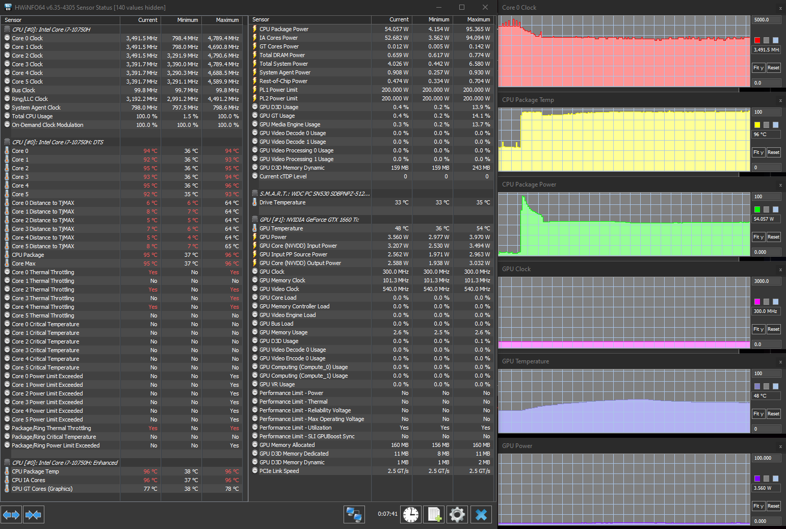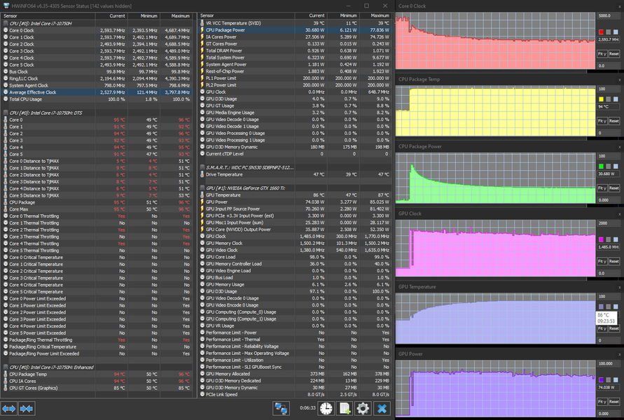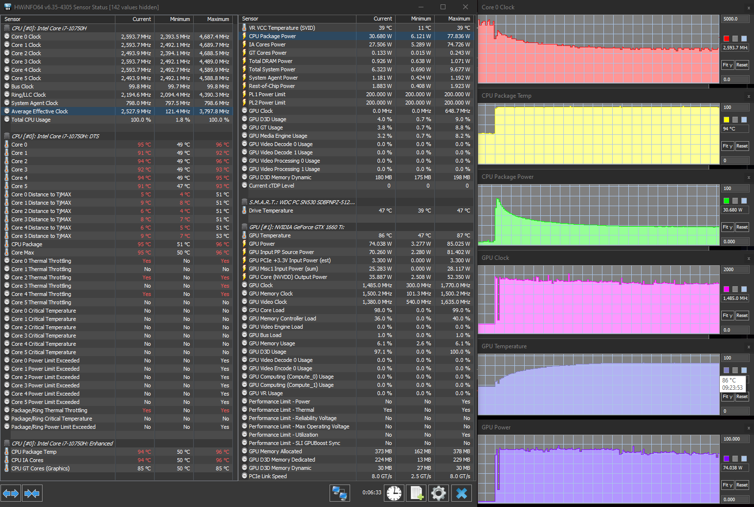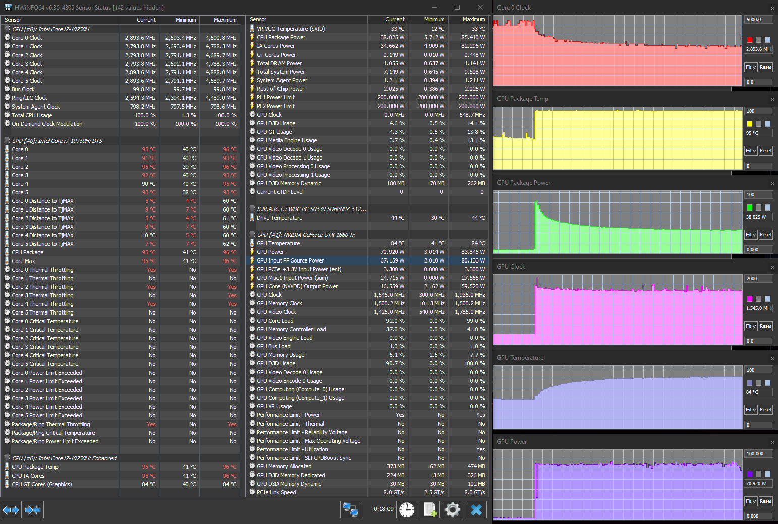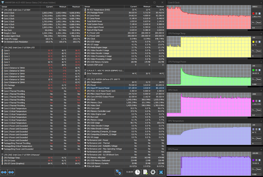 При максимальной нагрузке одновременно на процессор и видеокарту ожидаемо повторяется картина с перегревом процессора, только быстрее и сильнее. Потребление процессора здесь опускается даже ниже штатного, до 38 Вт, но сохраняется довольно высокая частота ядер, 2,8 ГГц (базовая у этого процессора — 2,6 ГГц). Перегрев и тротлинг нескольких ядер наблюдаются стабильно. Видеокарта функционирует при чуть сниженной частоте ядра (около 1560 МГц), но греется заметно сильнее, до 84 °C. Вентиляторы совсем быстро раскручиваются до 4200/3900 об/мин.