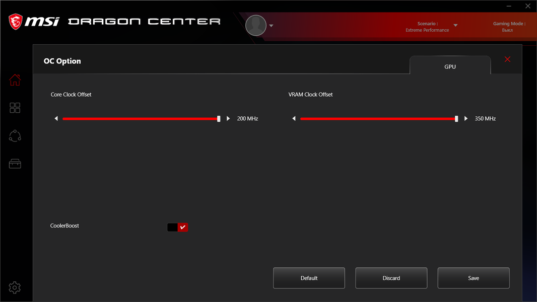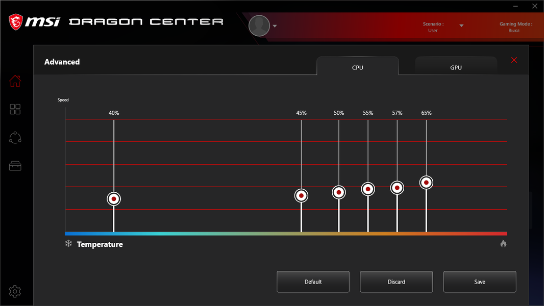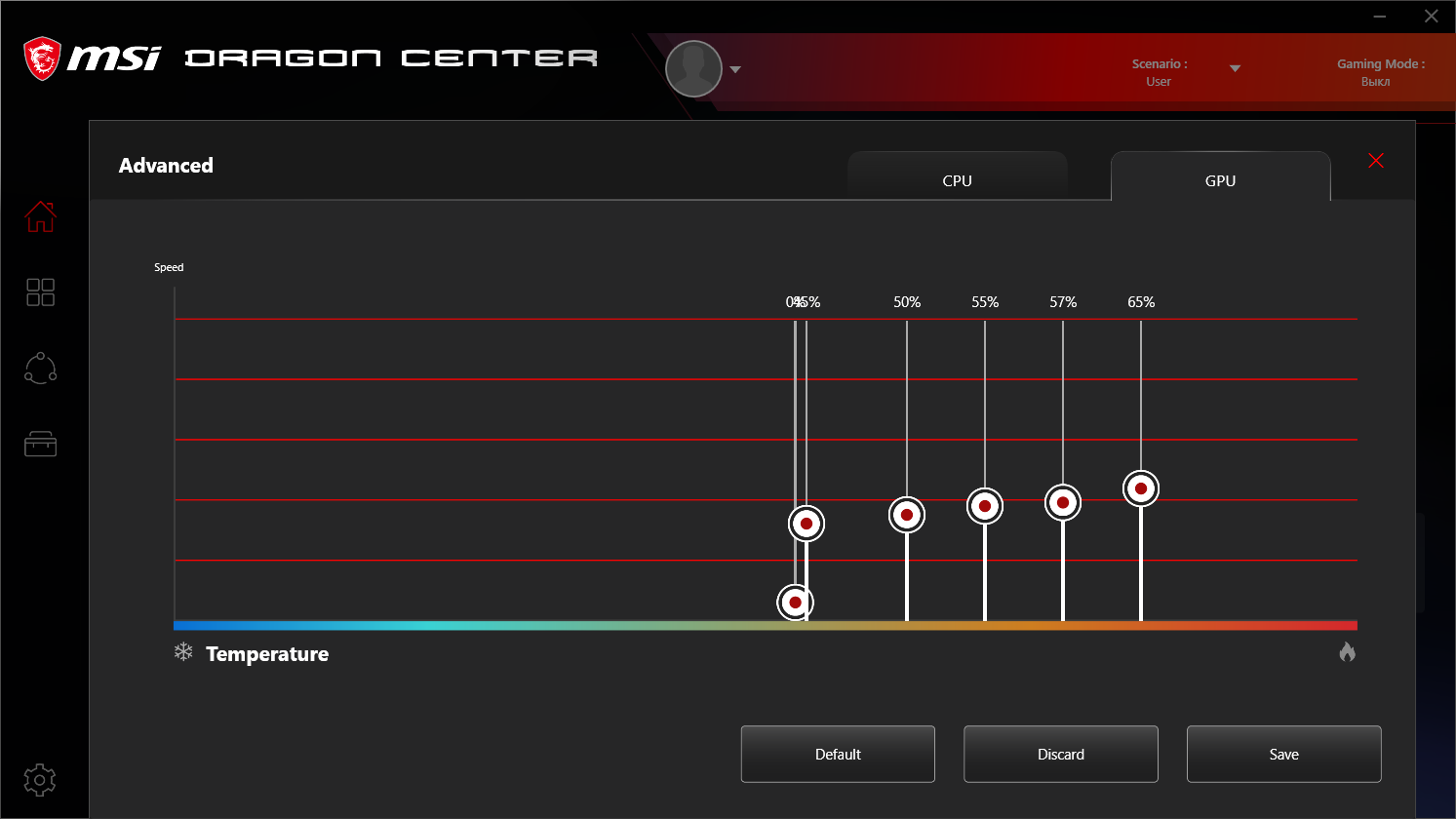 Также только в пользовательском сценарии можно выбрать и настроить продвинутый режим работы кулеров: задать кривую скорости вращения вентилятора (отдельно для кулеров CPU и GPU) по пяти точкам с условной степенью нагрева. При выборе уровня производительности Turbo для пользовательского сценария можно дополнительно разогнать видеокарту (до +200 МГц частоты ядра и до +350 МГц частоты памяти), для сценария Extreme Performance это стандартная настройка.