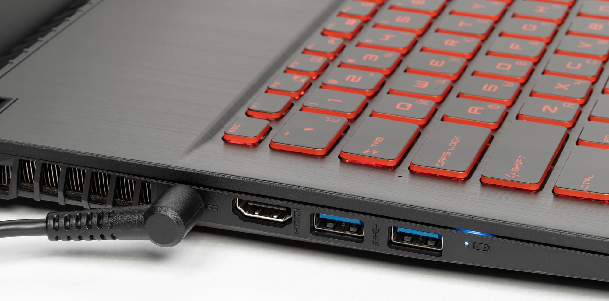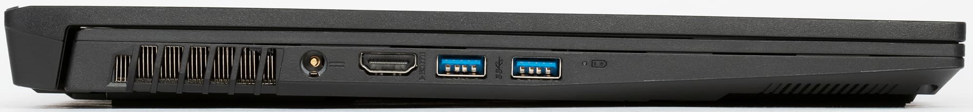 На левом боку ноутбука можно найти разъем питания под фирменный круглый в сечении штекер, видеовыход HDMI и 2 порта USB 3.0 Type-A.