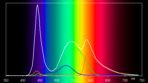 Ниже приведен спектр для белого поля (белая линия), наложенный на спектры красного, зеленого и синего полей (линии соответствующих цветов):