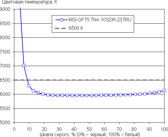 Баланс оттенков на шкале серого хороший, так как цветовая температура близка к стандартным 6500 К, и отклонение от спектра абсолютно черного тела (ΔE) ниже 10, что для потребительского устройства считается приемлемым показателем. При этом цветовая температура и ΔE мало изменяются от оттенка к оттенку — это положительно сказывается на визуальной оценке цветового баланса. (Самые темные области шкалы серого можно не учитывать, так как там баланс цветов не имеет большого значения, да и погрешность измерений цветовых характеристик на низкой яркости большая.)