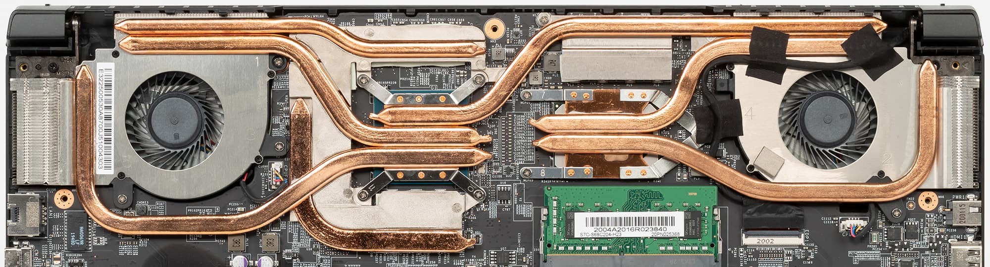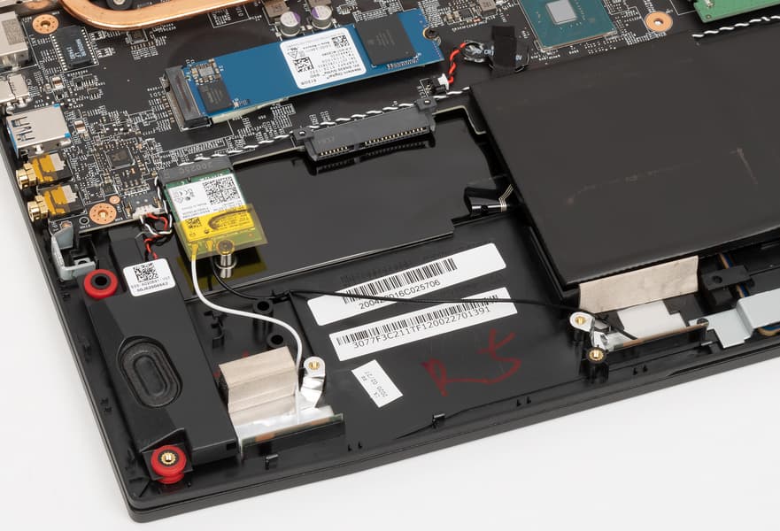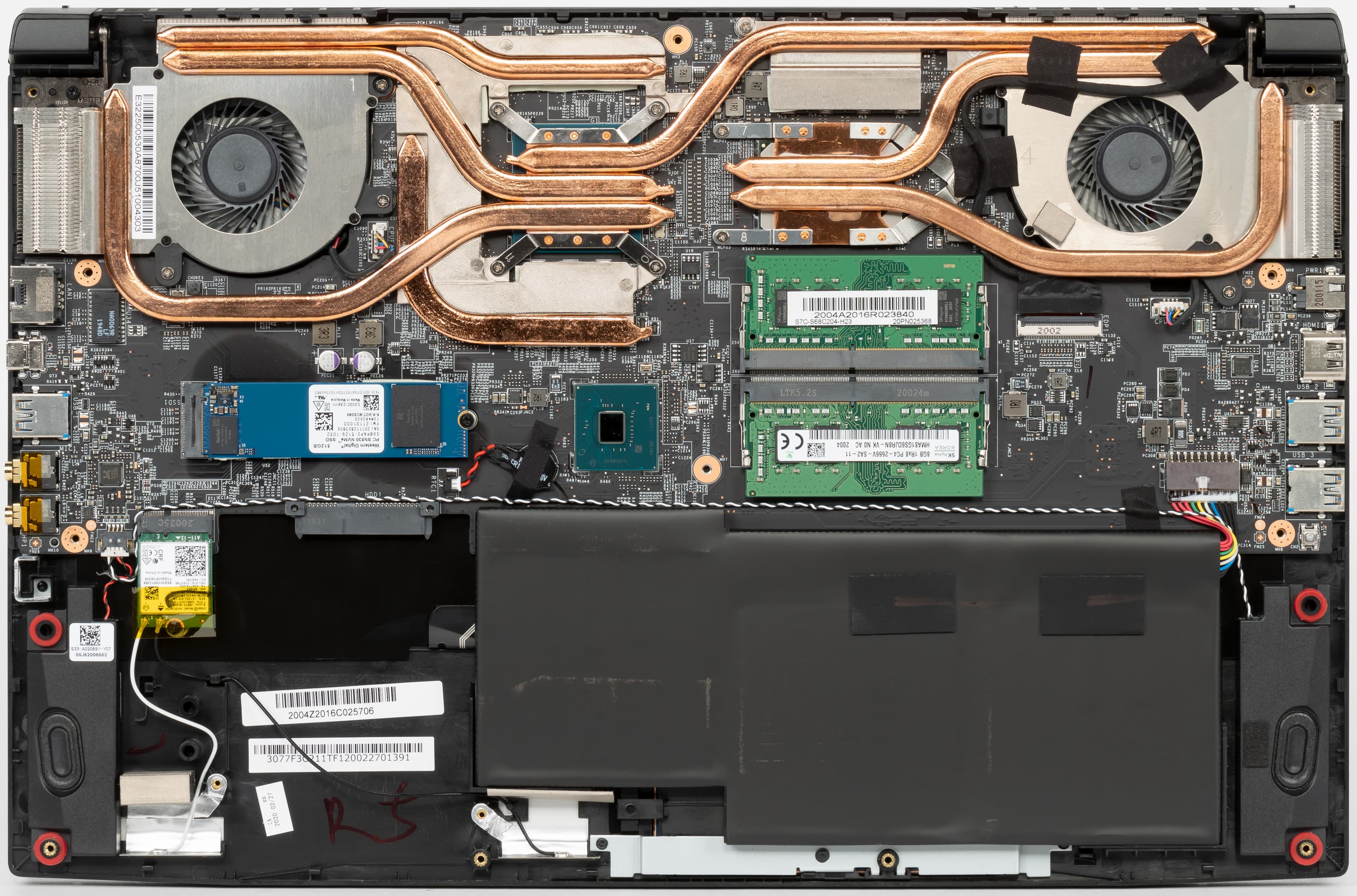 Чтобы снять нижнюю панель корпуса, надо открутить несколько винтиков под крестовую отвертку. Это открывает доступ к обоим кулерам, батарее, беспроводному сетевому адаптеру, SSD-накопителю в слоте M.2 и двум модулям памяти в слотах SO-DIMM. Также в ноутбуке предусмотрено место для установки 2,5-дюймового HDD/SSD — в нашем случае оно пустовало.