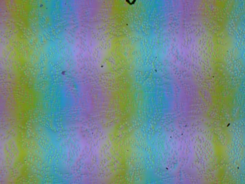 Зерно этих дефектов в несколько раз меньше размеров субпикселей (масштаб этих двух фотографий примерно одинаковый), поэтому фокусировка на микродефектах и «перескок» фокуса по субпикселям при изменении угла зрения выражены слабо, из-за этого нет и «кристаллического» эффекта.