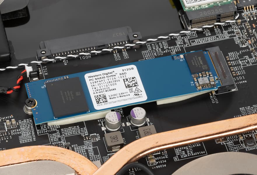 В нашей модификации ноутбука был установлен SSD-накопитель WDC PC SN530 на 512 ГБ. Это NVMe-диск, установленный в слот M.2 и подключенный к внутреннему порту PCIe x4. Линейные скорости чтения и записи у него высокие.
