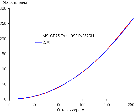 Аппроксимация полученной гамма-кривой дала показатель 2,06, что ниже стандартного значения 2,2, поэтому картинка чуть высветлена. При этом реальная гамма-кривая мало отклоняется от аппроксимирующей степенной функции: