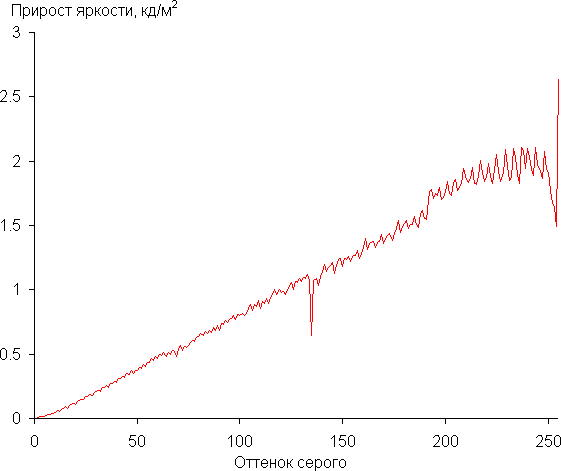 Далее мы измерили яркость 256 оттенков серого (от 0, 0, 0 до 255, 255, 255). График ниже показывает прирост (не абсолютное значение!) яркости между соседними полутонами: