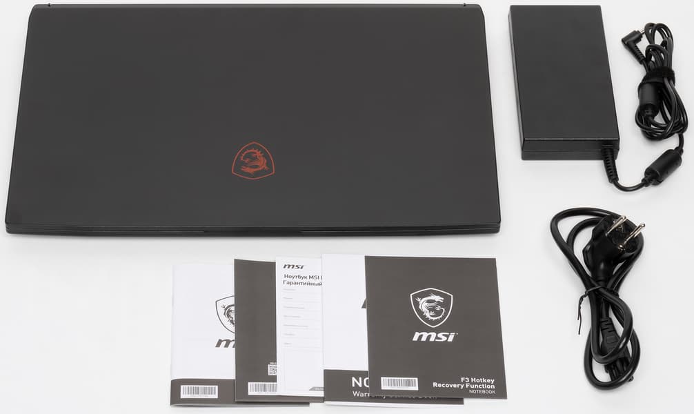 В обычной картонной коробке (без ручки для переноски) вместе с ноутбуком можно найти только адаптер питания на 180 Вт весом около 600 г с суммарной длиной двух кабелей 2,8 м и печатную продукцию.