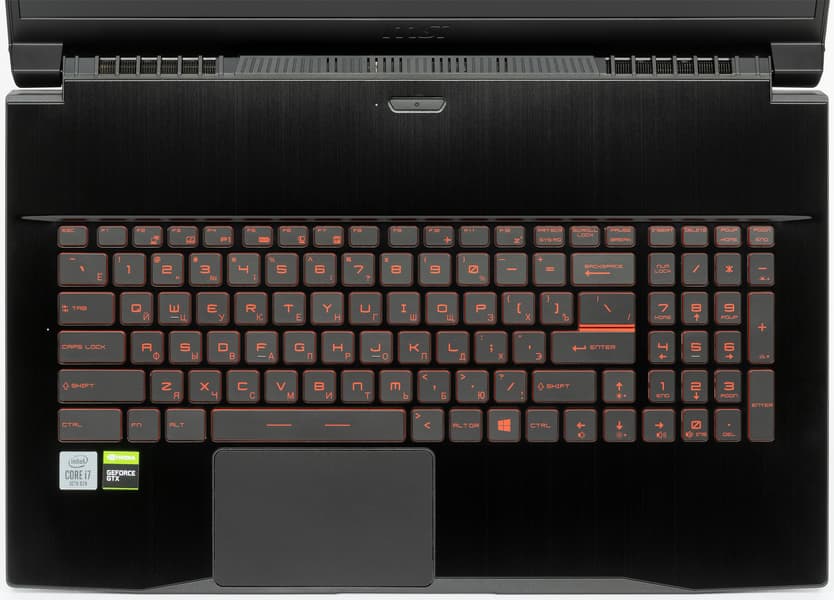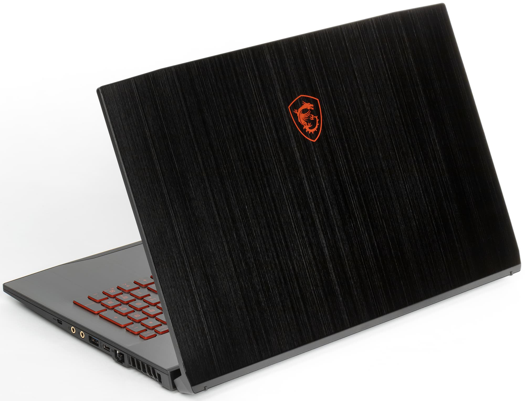Так или иначе, внешность у MSI GF75 Thin 10SDR симпатичная: игровую направленность выдают только красная подсветка клавиатуры и красный же дракончик на крышке — логотип игровой серии ноутбуков компании. Корпус пластиковый (не забываем про вес), но на крышке и на рабочей поверхности смонтированы алюминиевые пластины — именно там, где их можно заметить и где они имеют значение. В результате на ощупь корпус действительно приятный. Поверхность пластин имеет характерный вид шлифованного металла.