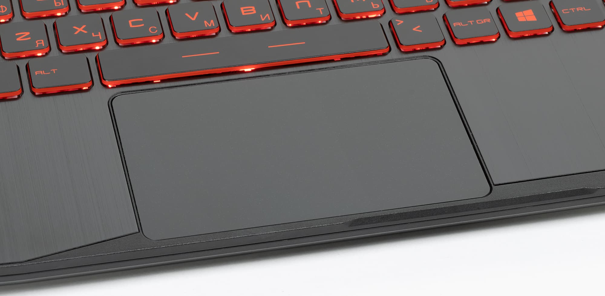В традиционном месте под клавиатурой расположен заглубленный кликпад размером 106×66 мм. У него нет выделенных клавиш, но сенсорная площадка поддерживает нажатия условно в левом нижнем и правом нижнем углах, что соответствует нажатиям стандартных кнопок мышки. Авторы обзора не являются любителями кликпадов, по условным кнопкам не всегда удается попасть с первого раза, а сложные операции, типа выделения и перетаскивания, здесь осуществлять совсем неудобно. Если же ограничиться только жестами на касание, в том числе для прокрутки содержимого окна и вызова контекстного меню, то претензий к тачпаду нет. Разумеется, поддерживаются все традиционные жесты, например для переключения рабочих столов, сворачивания и разворачивания окон, которые осуществляются двумя, тремя или четырьмя пальцами, но для горизонтальных четырехпальцевых жестов площадка кликпада все-таки маловата. Тачпад можно быстро отключить сочетанием клавиш. К сожалению, столь удобного в быту сканера отпечатков пальцев у ноутбука нет — видимо, это не геймерский атрибут.