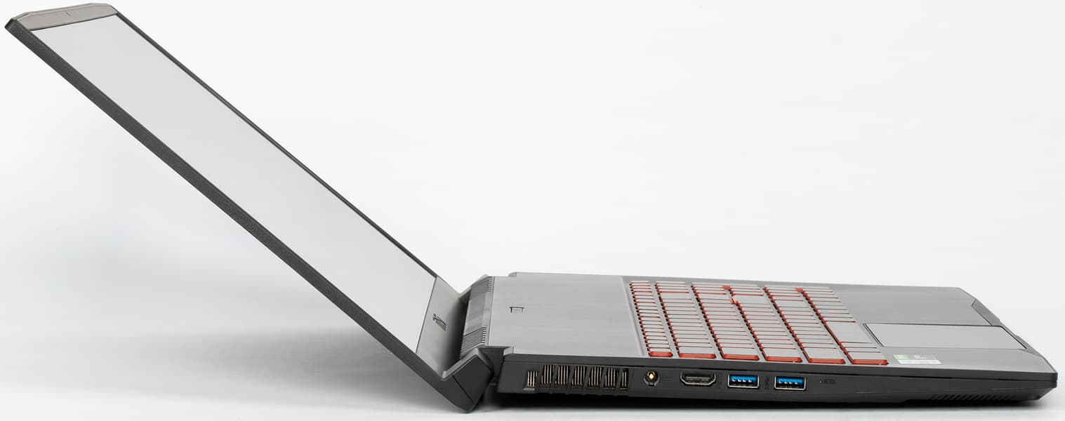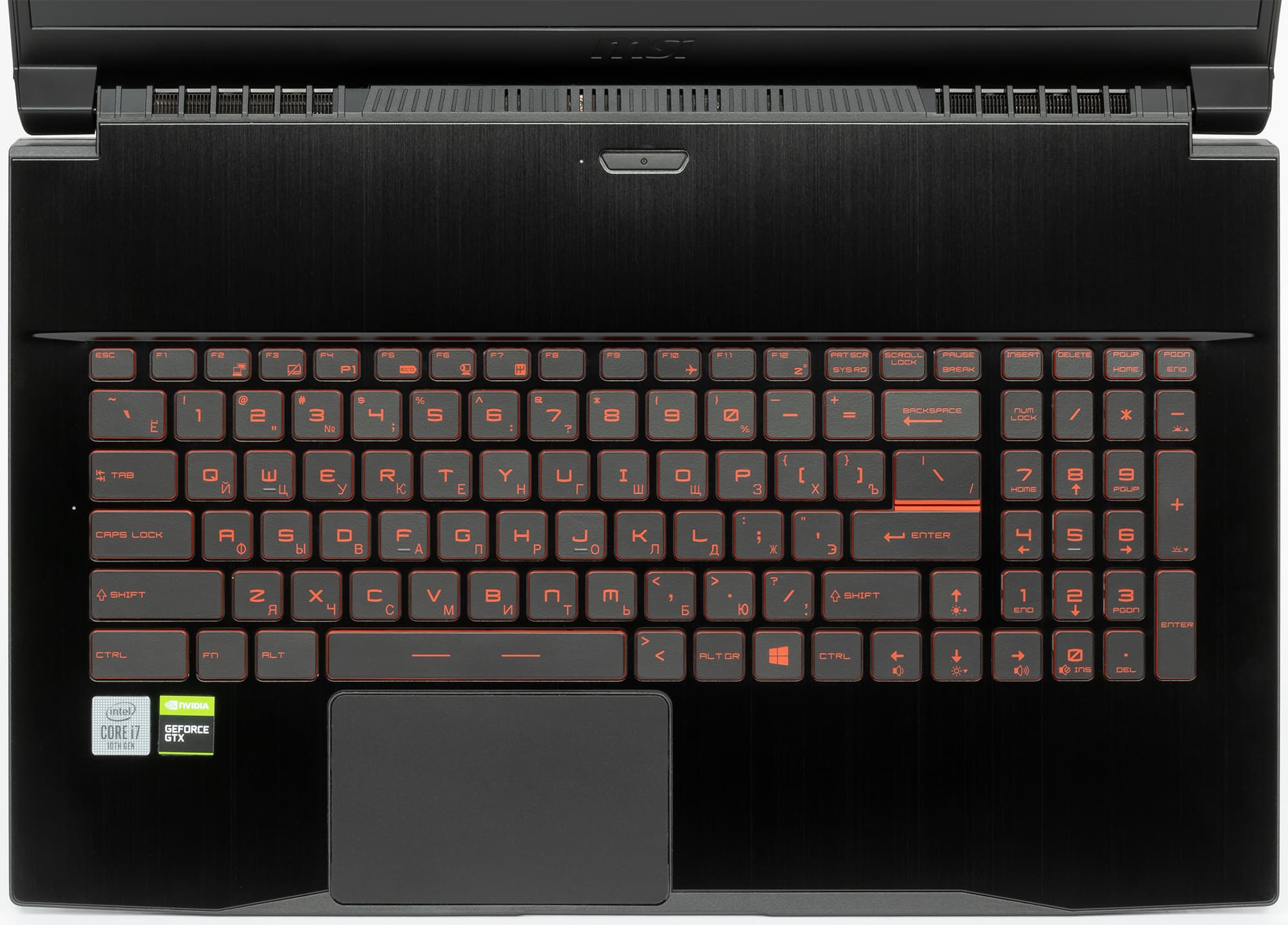 Несмотря на название серии, ноутбук не является совсем уж тонким. Линейные габариты у него, в общем, типичны для 17-дюймовых моделей (если не брать «гробы» топовой линейки GT Titan), толщина ближе к двум сантиметрам, чем к трем, что очень неплохо, но есть в арсенале MSI игровые модели и потоньше — например, в линейке GS Stealth. Вот по весу (2,2-2,3 кг) MSI GF75 Thin действительно выглядят впечатляюще, обычно игровые ноутбуки весят хорошо за 2,5 кг. Это будет являться преимуществом, если вам надо долго и много таскать такой ноутбук на себе, но ведь тяжелыми игровые модели делают не потехи ради — металл идет на кулеры.
