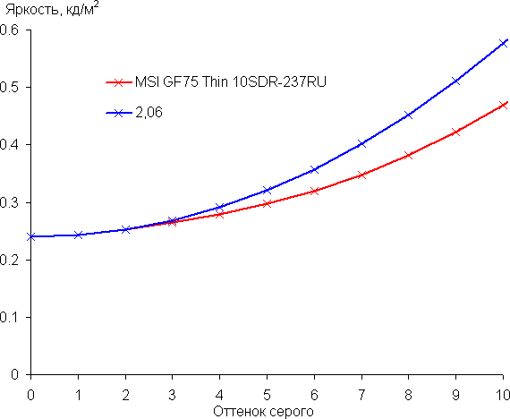 Рост прироста яркости на большей части шкалы серого более-менее равномерный, и каждый следующий оттенок ярче предыдущего. В самой темной области аппаратно и визуально различаются все оттенки:
