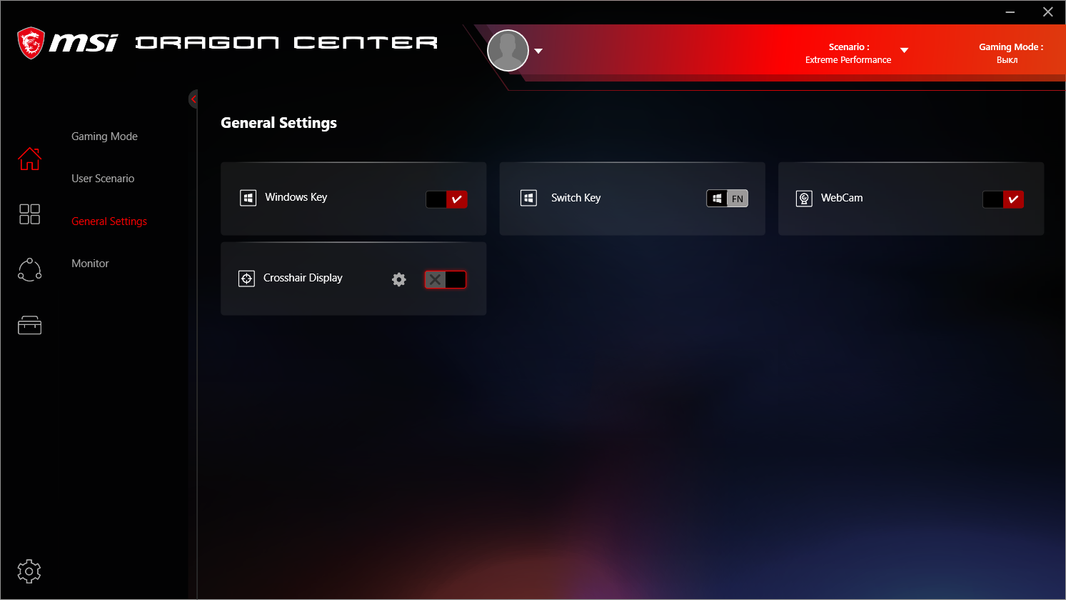Также в утилите есть раздел мониторинга (только здесь можно увидеть скорость вращения вентиляторов), можно выбрать режим зарядки батареи (подробнее см. в соответствующем разделе) и сделать некоторые полезные настройки (включить/отключить камеру, экранный прицел и кнопку Win, поменять местами кнопки Fn и Win).