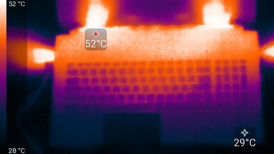 Ниже приведены термоснимки, полученные после долговременной работы ноутбука под максимальной нагрузкой на CPU и GPU (профиль Extreme Performance):