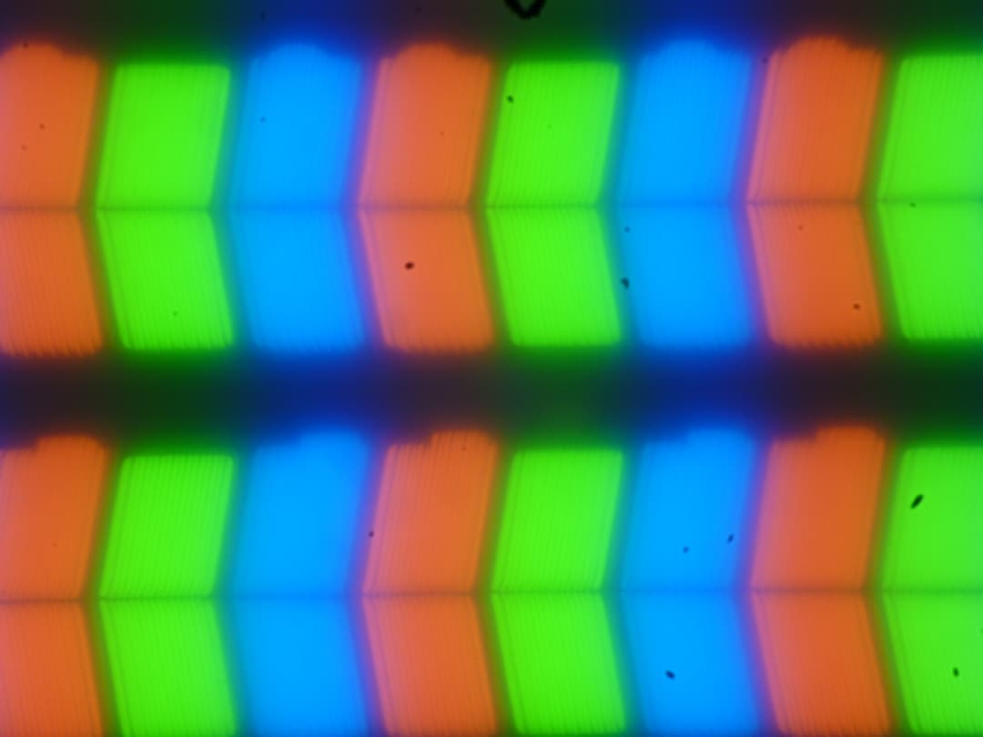 В этом ноутбуке используется матрица типа IPS. Микрофотографии демонстрируют типичную для IPS структуру субпикселей (черные точки — это пыль на матрице фотоаппарата):